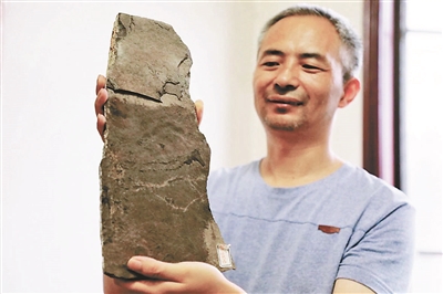 陈哲回忆,当时20多个人劈上一天,也未必能发现一块化石。“相比辛苦,更难熬的是枯燥,一整天除了劈开不少石头,什么发现都没有。有一天,我劈开一块石头,发现这块石头里有一些特别的痕迹,当时我觉得这个可能是古生物的足迹化石,便将它放在包里背了回来。”