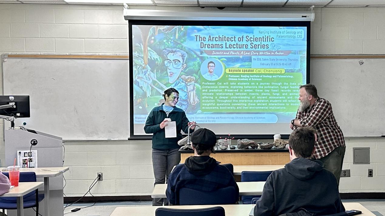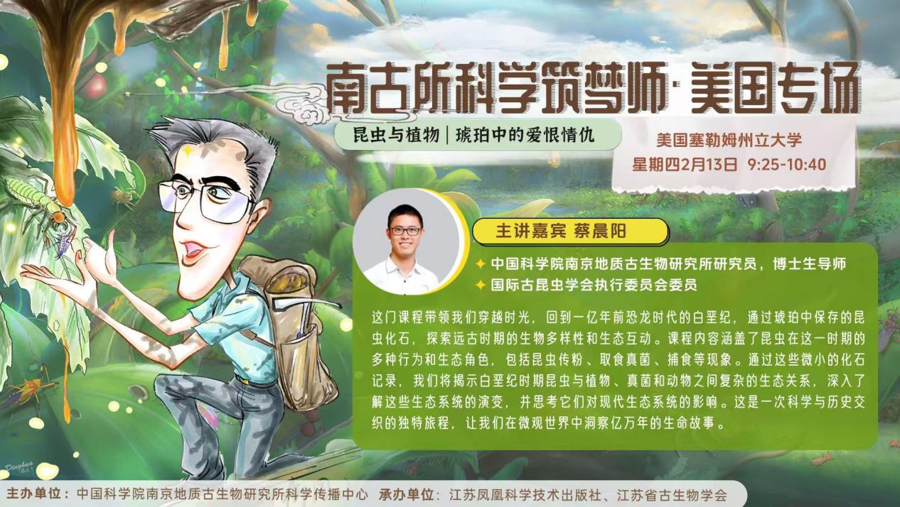 美国当地时间2025年2月13日,由江苏省古生物学会承办的科普品牌创建项目“科学筑梦师”走进美国,在马塞诸塞州塞勒姆市的塞勒姆州立大学成功举办美国专场科普讲座。此次科普讲座,恰逢临近西方情人节,“科学筑梦师”讲师、学会会员、中国科学院南京地质古生物所研究员蔡晨阳以“琥珀中的爱恨情仇”为主题,通过琥珀中的昆虫和植物化石,描述了一个充满生机相爱相杀的中生代生境,引起了美国大学生们极强的兴趣。