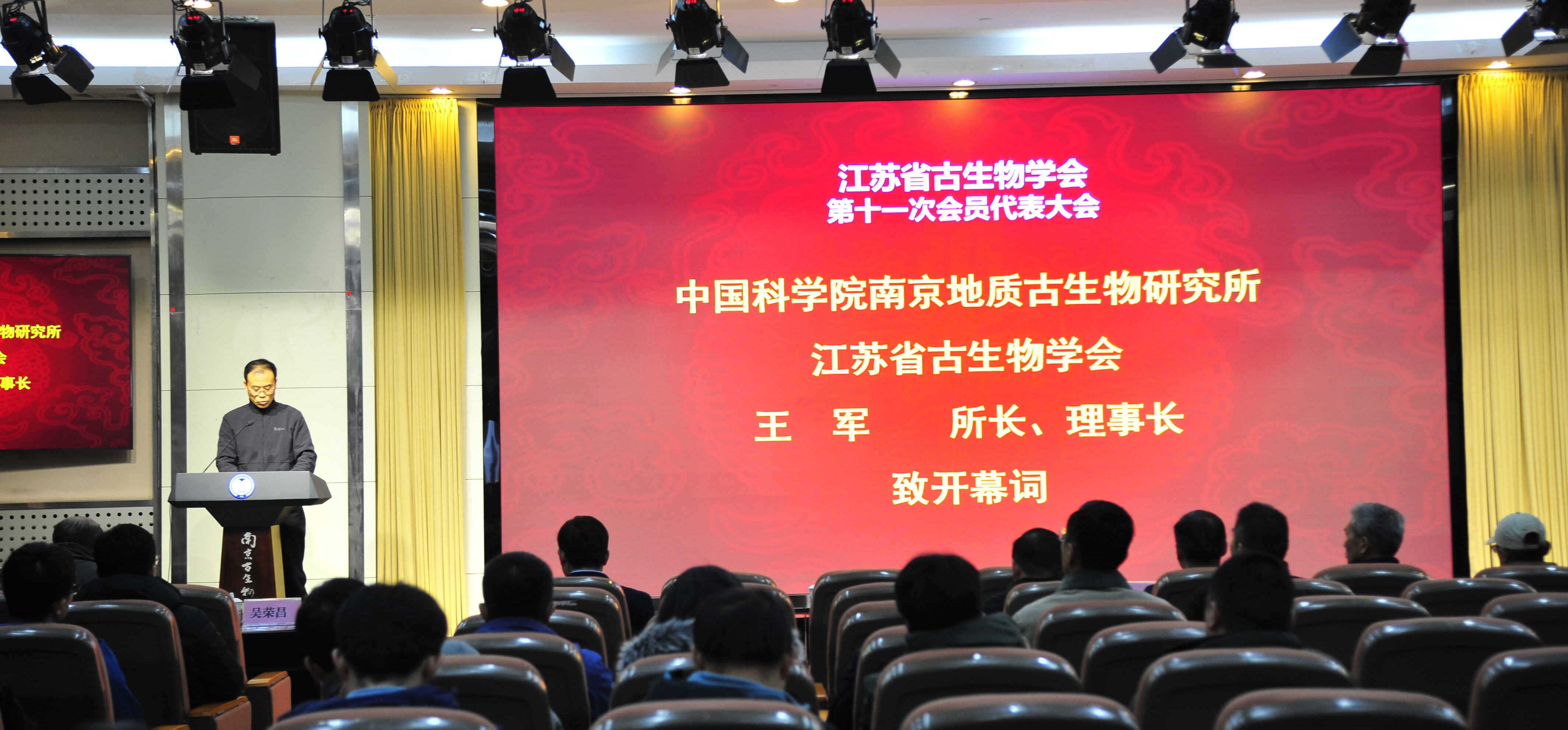 江苏省古生物学会理事长、中国科学院南京地质古生物研究所所长王军致开幕词,他表示研究所会继续全方位支持江苏省古生物学会的工作,并利用现有资源为江苏省广大地质古生物工作者服务。