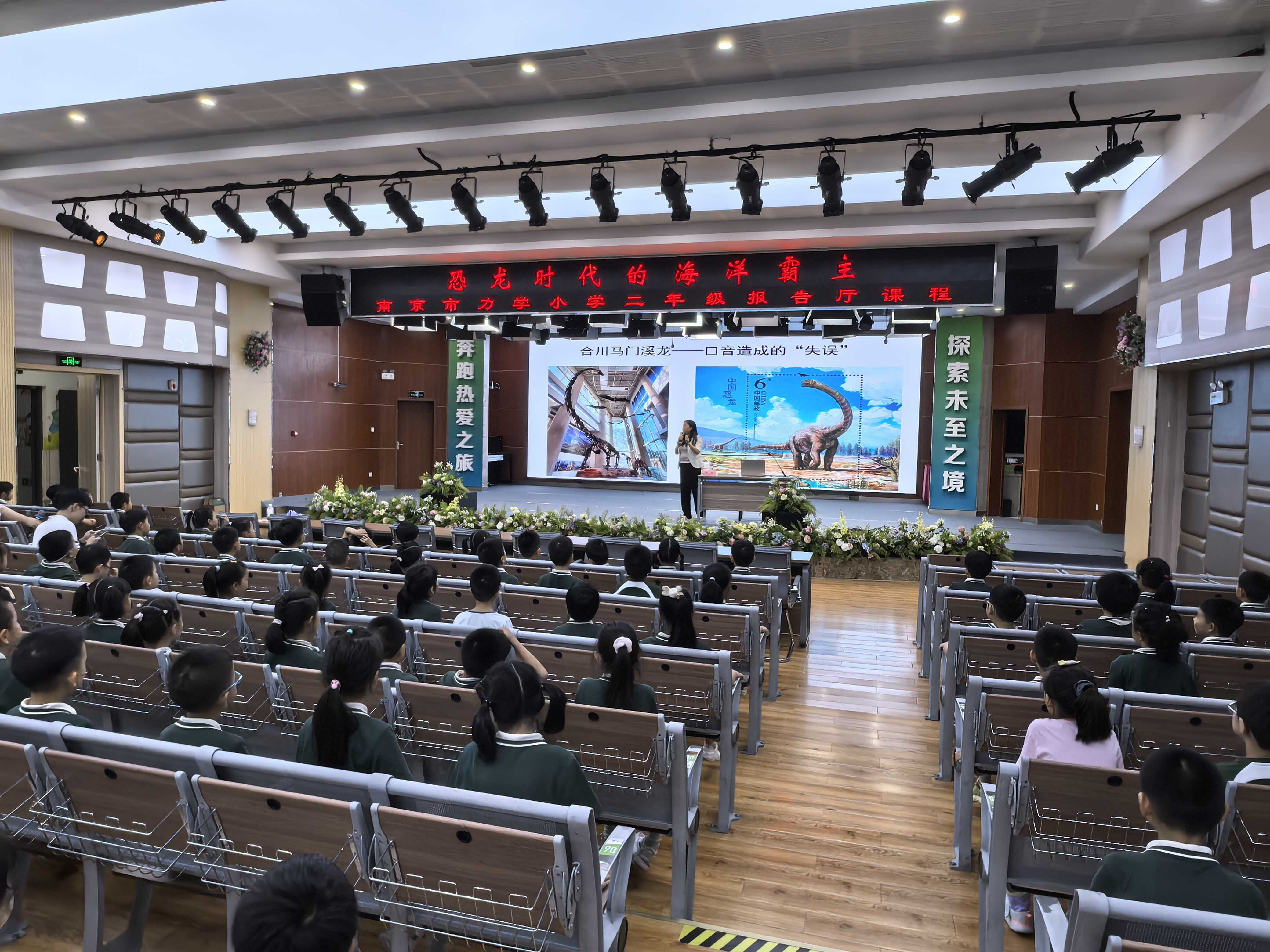 9月4日下午,由江苏省科学技术协会、江苏省科学传播中心、江苏省古生物学会共同举办的“古生物知识进校园——科普江苏·院士专家科普基层行”系列活动走进南京市力学小学。中国科学院南京地质古生物研究所研究员、南京古生物博物馆副馆长季承作《恐龙时代的海洋霸主》的科普讲座。南京力学小学二年级新生近500人参加活动。