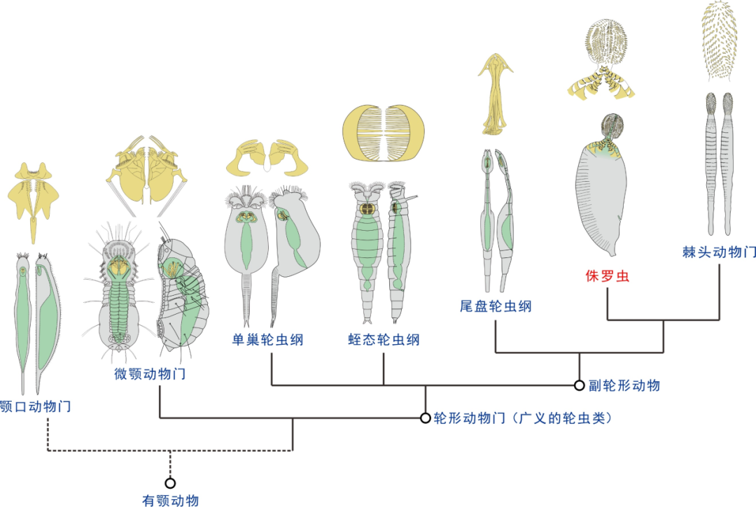 因此,科学家们曾一度怀疑这枚化石是否真的是棘头虫。然而,进一步的调查显示,这种复杂的颚器在棘头虫可能的祖先——轮虫中却是广泛存在的。轮虫是一类微小的浮游生物,头部具有1–2圈能旋转的纤毛构成的“轮盘”,形如车轮,故叫轮虫。这个发现使科学家们重新思考了棘头虫的起源与演化,也为解释这枚化石的特殊结构提供了一个合理的假设。