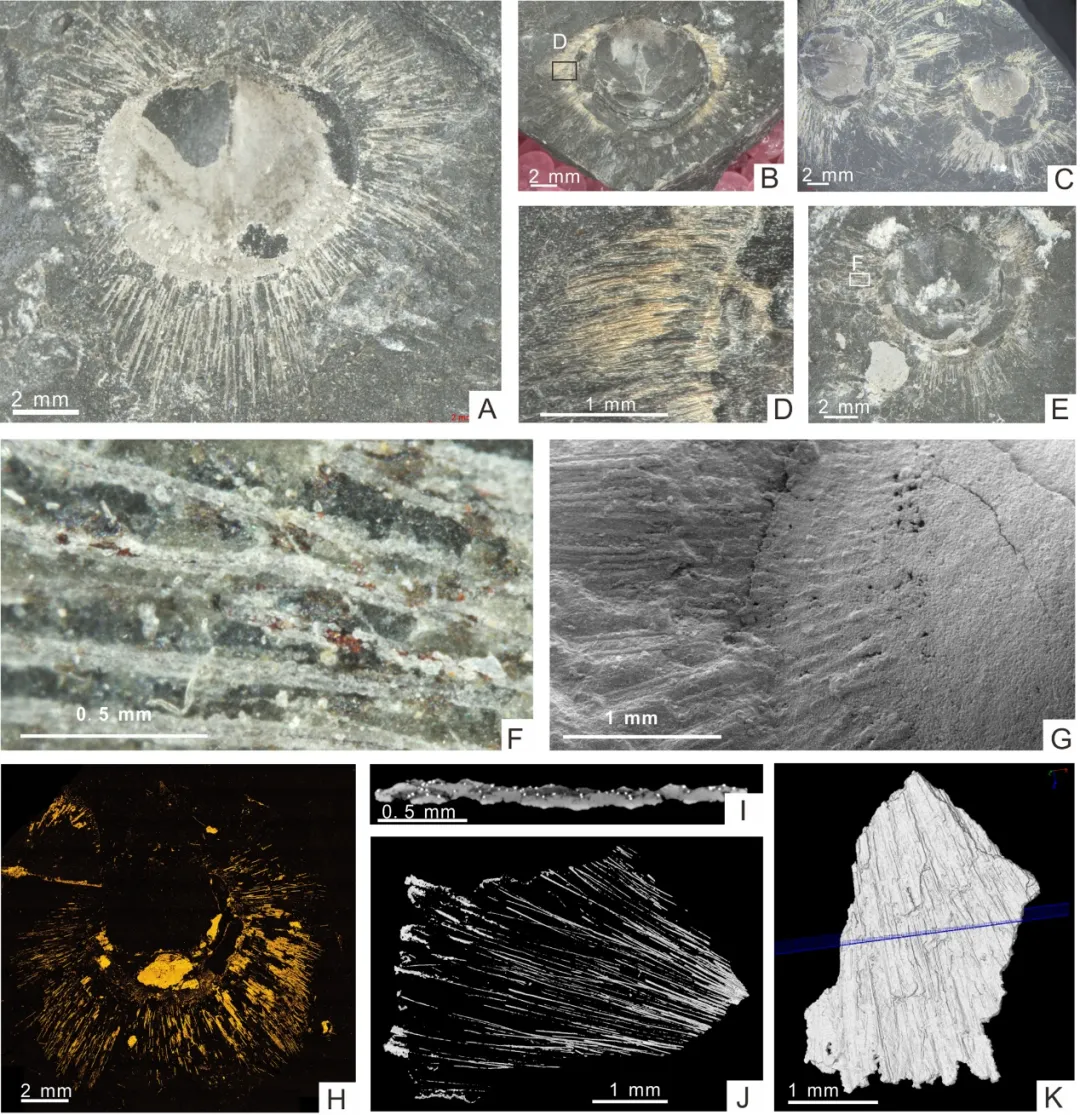 遮隐核螺贝保存于矿化层下的刚毛形态(A-F); 及其显微结构(F-H)与显微CT三维重建(I-K)(图片来源:参考文献[1])