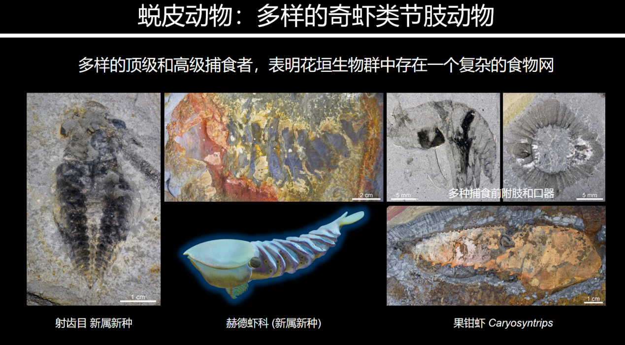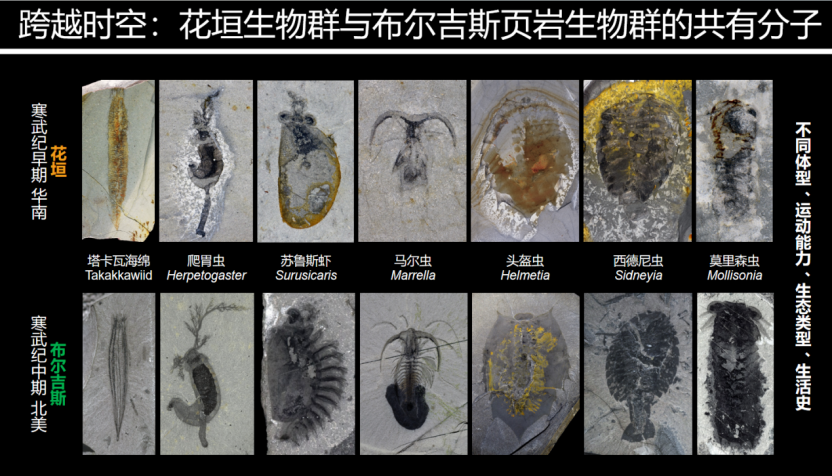 这里发现了来自750公里外中国云南关山生物群占主导的奇虾类,还有加拿大布尔吉斯页岩生物群中的多种代表性动物,比如马尔虫、西德尼虫等,而那个时期的华南和北美之间被大洋隔开了相当于半个地球的距离。这些运动能力、生态类型、生活史等不同的动物在花垣生物群中的存在,表明该时期寒武纪海洋动物存在长距离跨洋扩散的机制。