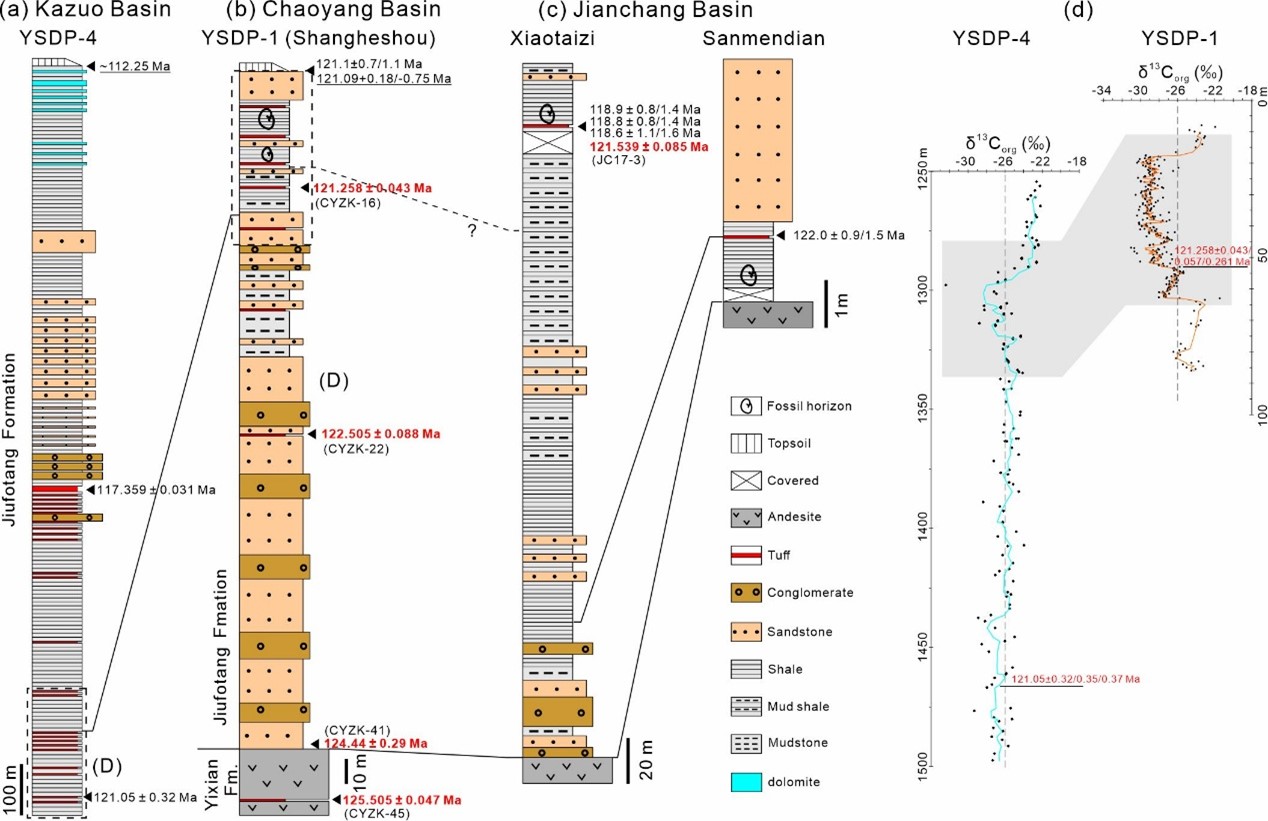 近期,中国科学院南京地质古生物研究所副研究员王亚琼联合韩国大邱自然馆高级研究员Byung-Do Choi、中国科学院广州地球化学研究所副研究员钟玉婷以及南京大学教授泮燕红等国内外科研人员,基于陆相介形类化石生物地层学及高精度定年,对东亚多个陆相沉积盆地的白垩纪地层序列和时代框架取得了系统性研究进展。白垩纪是地球历史上典型的“温室”时期,其陆相记录对理解现代全球变化具有重要参考价值。东亚作为当时最大的陆块,发育了完整的白垩纪陆相地层序列,保存了丰富的化石记录,为研究温室背景下陆地生态系统演化与重大地质事件的关系提供了重要材料。而这一切研究的基础,在于建立高精度的地层层序与时间框架。近期,中国科学院南京地质古生物研究所副研究员王亚琼联合韩国大邱自然馆高级研究员Byung-Do Choi、中国科学院广州地球化学研究所副研究员钟玉婷以及南京大学教授泮燕红等国内外科研人员,基于陆相介形类化石生物地层学及高精度定年,对东亚多个陆相沉积盆地的白垩纪地层序列和时代框架取得了系统性研究进展。具体研究进展:1、报道了吉林白山盆地小南沟组介形类动物群,通过介形类生物地层学研究,明确了小南沟组的沉积时代为早阿尔布期(early Albian);2、对平凉地区六盘山群介形类化石进行了重新梳理,利用介形类生物地层学对比明确李洼峡组的时代阿普第期—阿尔布期(Aptian-Albian),马东山组的时代为阿尔布阶(Albian),显著缩短六盘山群整体沉积时限;3、对鄂尔多斯盆地泾川组介形类化石展开了系统古生物学和生物地层学研究,明确了泾川组的地质年代为阿普特期(Aptian);这为进一步探讨白垩纪副热带的时空分布特征提供了可靠的“时间”数据;4、基于文献和新采集的材料,系统综述了韩国白垩纪介形类动物群分布及演替特征。建立了韩国白垩纪陆相盆地介形类生物地层序列,揭示了以不稳定浅水湖泊为主的古环境背景,并明确了东亚地区(特别是中-韩-蒙之间)在白垩纪中晚期存在频繁的生物交流;5、对韩国庆尚盆地Banyaweol组和Geoncheonri组介形类化石的再研究表明,在晚白垩世早期,该地区介形动物群就与东亚其他地区(尤其是中国)存在广泛的生物交流;这一研究成果也为揭示整个白垩纪中晚期东亚地区陆相介形类动物群的演替特征提供了新线索;6、通过开展高精度铀-铅地质年代学(CA-ID-TIMS U-Pb)、有机碳同位素、贝叶斯年龄模型与旋回地层学的研究,明确了辽西地区九佛堂组的年代范围为124.44–112.25 Ma(early Barremian to early Aptian)(此结果与早期介形类生物地层学研究结果高度一致,参见Wang et al., 2015 Micropaleontology);而热河生物群晚期的时间跨度约为124–121 Ma,较以往认识缩短约1 Ma。以上研究显著提升了东亚白垩纪陆相地层研究的精度和可靠性,为更深入理解白垩纪陆地生态系统的演变历程以及东亚与全球古地理、古气候事件的关联提供了至关重要的时间标尺和地层学依据。相关研究得到国家自然科学基金委基础中心项目、面上项目和中韩合作交流项目的联合支持。论文相关信息:1. Yaqiong Wang*, 2025. First report of the non-marine ostracod fauna from the Lower Cretaceous Xiaonangou Formation of the Baishan Basin, NE China. Zootaxa, 5660(4): 560-572. https://doi.org/10.11646/zootaxa.5660.4.6.2. Yaqiong Wang*, Byung-Do Choi, Robin J. Smith, Deyan Wu, 2025. Application of Ostracoda from the Lower Cretaceous Liupanshan Group at Pingliang (NW China) – Biostratigraphy and palaeoecology. Cretaceous Research, 168: 106079. https://doi.org/10.1016/j.cretres.2025.106079.3. Huazheng Zhu, Yaqiong Wang*, Byung-Do Choi, Yanhong Pan, 2025. Ostracod fauna from the Early Cretaceous Jingchuan Formation of Ordos Basin and its biostratigraphic significance. Cretaceous Research, 168: 106068. https://doi.org/10.1016/j.cretres.2024.106068.4. Byung-Do Choi, Yaqiong Wang, 2025. Cretaceous non-marine ostracod faunas of South Korea: Synthesis of taxonomy, biostratigraphy, paleobiogeography and paleoecology. Cretaceous Research, 168: 106070. https://doi.org/10.1016/j.cretres.2024.106070.5. Byung-Do Choi*, Yaqiong Wang*, 2025. Non-marine ostracods from the Cretaceous Banyaweol and Geoncheonri formations (Gyeongsang Basin, Korea) in the collections of the Geological Museum, KIGAM: Taxonomy, biostratigraphy, palaeobiogeography and palaeoenvironment. Historical Biology, 37(4): 933-949. https://doi.org/10.1080/08912963.2024.2341858.6. Yu-Ting Zhong, Magdalena H. Huyskens, Run-Jian Chu, Han-Qing Yang, Jian-Fang Hu, Ya-Qiong Wang, Shi-Xi Cai, Qiong Wu, Qiang Ma, Huai-Chun Wu, Qing-Zhu Yin, Yi-Gang Xu, 2025. High-precision geochronology of the Early Cretaceous Jiufotang Formation: Temporal constraints on the late phase of the Jehol Biota. Earth and Planetary Science Letters, 671: 119688. https://doi.org/10.1016/j.epsl.2025.119688.图1 平凉地区六盘山群特征介形类Liupanshania typica图2 韩国白垩纪盆地介形类组合及动物群演替图3. (a) 喀左盆地:YSDP-4岩心, (b) 朝阳盆地:YSDP-1岩心/上河首剖面, (c) 建昌盆地:肖台子和三门店剖面, (d) YSDP-4与YSDP-1的δ13Corg有机碳同位素曲线; (a)和(c)分别据Sun et al. (2025)和Yu et al. (2021)修改; 红色加粗年龄为本研究获得的U-Pb高精度测年数据, 带下划线的年龄源自贝叶斯年龄-深度模型计算.