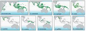 插图1 现代海桑属Sonneratia植物(左)及其不同种类的地理分布格局(右)