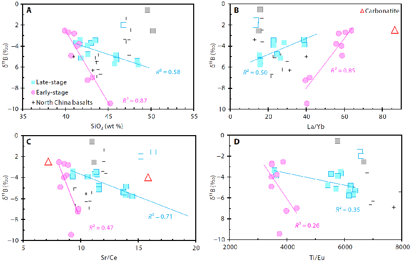 为解决这些问题,近日,中国科学院南京地质古生物研究所研究员蔡悦与中国科学院地球化学研究所副研究员徐荣联合国内外团队,运用前沿高精度硼同位素分析技术(Cai et al.,2021;2023a,b),对中国东南部浙江地区两组相对原始的新生代板内玄武岩展开研究。团队发现硼同位素与关键地球化学指标存在显著相关性(图1),揭示出三类地幔端元组分的混合贡献,并识别出两种不同的混合趋势:一、年轻玄武岩:受浅部岩石圈地幔组分影响;二、古老玄武岩:携带深部俯冲板片组分的信号。尤为关键的是,两组玄武岩共享一个高δ¹¹B、低B/Ce比值且流体活动性弱的共同端元。精细分析排除了富硼流体(如来自俯冲洋壳、沉积物或蛇纹岩的流体)的贡献——这与传统认知相悖。相反,重硼同位素(高δ¹¹B)与碳酸盐相关地球化学指标的强关联性表明,再循环地表碳酸盐是这一信号的主要来源。