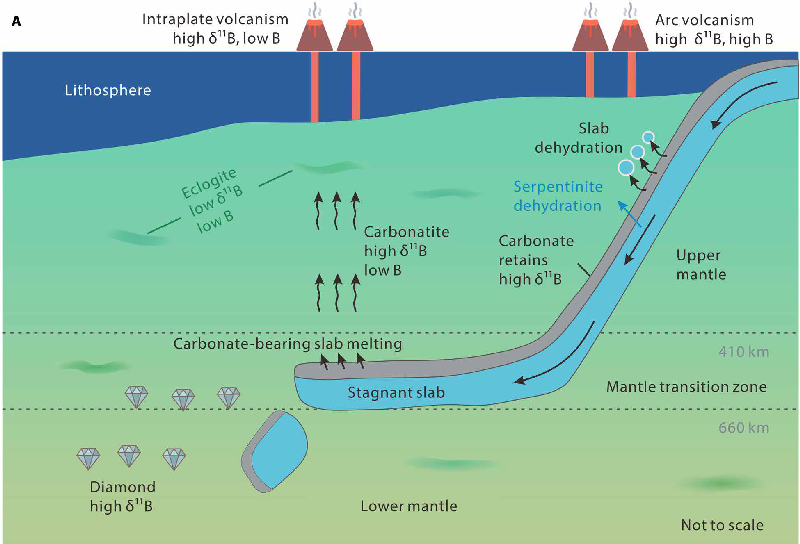 图2. 俯冲进入深部地幔以及再循环到地表过程中硼同位素行为示意图。