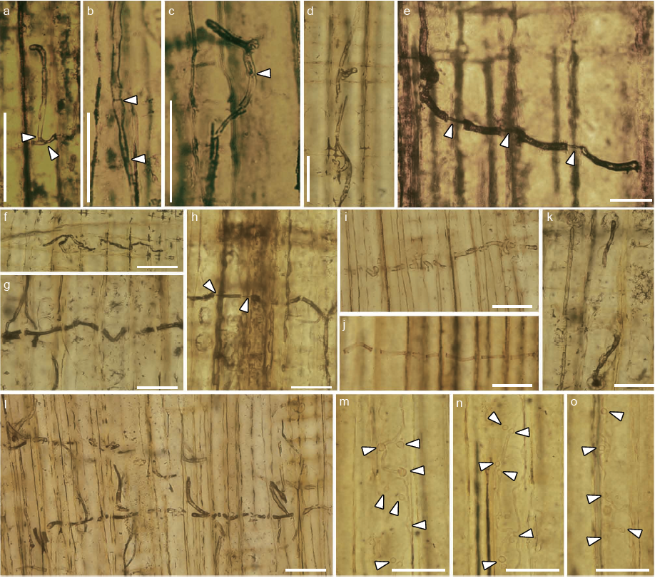 图2 辽西侏罗纪发现的蓝变真菌菌丝化石(a-c. 具横隔壁的真菌菌丝;d. 穿过交叉场的分叉的菌丝;e- j. 木材径切面,示横穿管胞壁的菌丝,箭头指示典型的“穿透钉”结构;k. 穿过管胞径壁纹孔的菌丝;b-c. 横切面扭曲的生长轮;d-e. 木材径切面管胞径壁纹孔;l. 木材弦切面,示横穿管胞壁的菌丝;m-o. 箭头示菌丝上着生的疑似厚垣孢子)