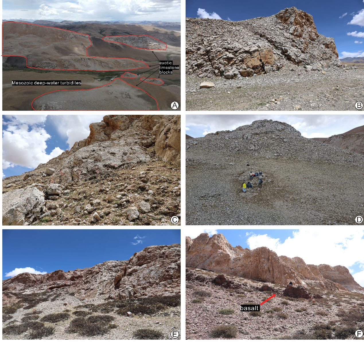 图1. 雅鲁藏布江缝合带西段外来体野外照片 (A. 扎来日地区外来体全貌;B. 扎来日1号剖面外来体宏观照片;C. 扎来日3号剖面外来体宏观照片;D. 毕久拉地区外来体照片;E. 姜叶玛2号剖面外来体宏观照片;F. 姜叶玛2号剖面中的玄武岩夹层)
