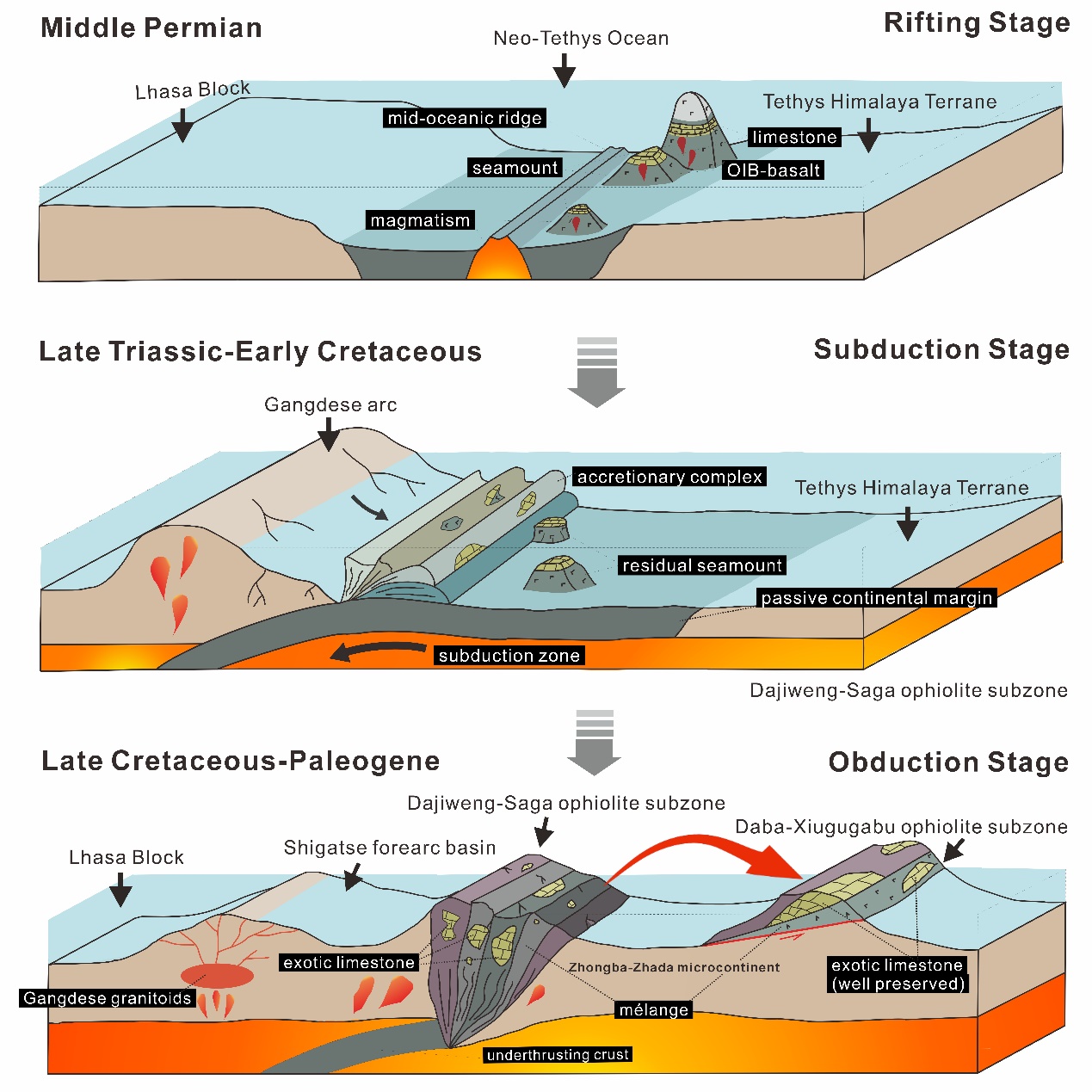 该项研究证实:新特提斯洋在早二叠世晚期打开,中二叠世时已在洋盆中形成了广泛的海山。新特提斯洋在后期闭合过程中发生了蛇绿岩仰冲,把大量的混杂岩及灰岩块体都整体搬运到仲巴-扎达微地块以南从而形成南亚带,而遗留在北亚带中的灰岩块体则受到了强烈的变质作用影响。该研究为新特提斯洋的打开时间以及雅鲁藏布江缝合带南、北亚带亲缘性提供了重要证据。