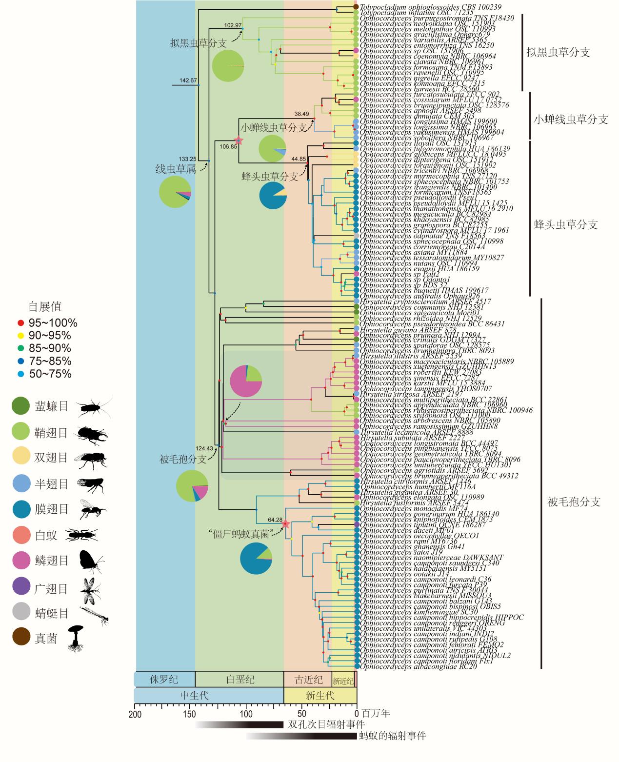 图3:线虫草属主要类群的分化时间估计及其祖先宿主特征。不同颜色代表不同宿主类型。