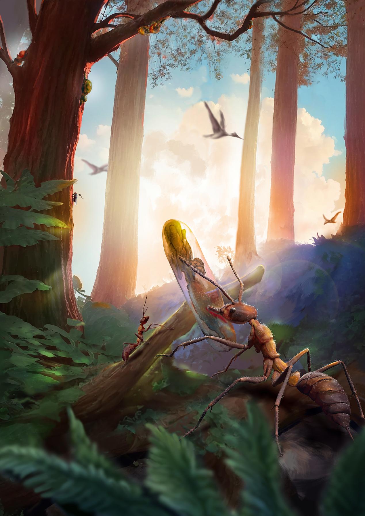 图4:白垩纪时期蚂蚁、蝇类与古线虫草的古生态重建图。(杨定华绘制)