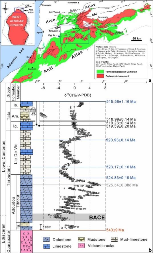 埃迪卡拉纪-寒武纪转折期是生物演化史上最关键的时期之一,见证了多细胞生物的出现和快速多样化。要准确理解这一重大生物事件的过程及其与古环境变化之间的关系,建立精确的全球年代地层对比框架至关重要。摩洛哥小阿特拉斯山地区是全球晚埃迪卡拉世–早寒武世碳酸盐岩地层序列最为发育的地区之一(图1),是开展相关研究的理想区域。然而,由于缺乏生物地层控制和对盆地构造演化的认识不足,目前对该地区埃迪卡拉系–寒武系界线(寒武系底界)的精确定位及其与盆地构造沉积演化的关系仍存在争议,这严重制约利用该套连续地层序列进行综合年代地层学、全球地层对比以及古环境重建等工作的展开。