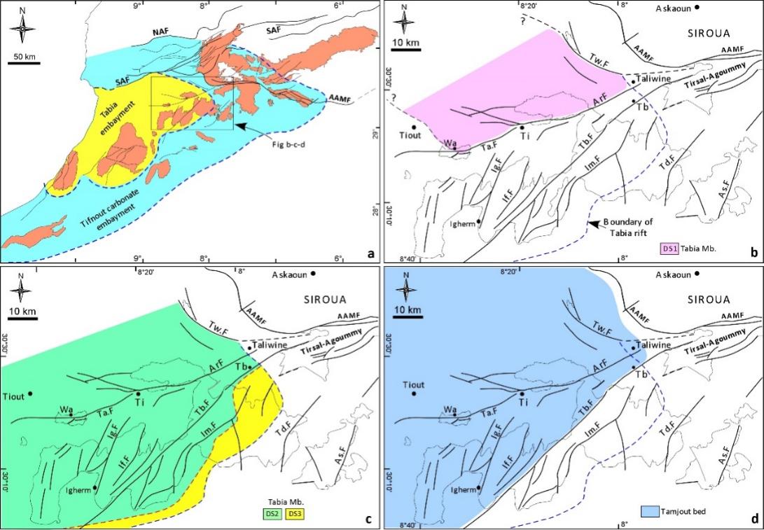 本研究发现Tabia段地层经历了三期同裂谷构造–沉积演化阶段,并在随后的 Tifnout 段转为后裂谷阶段(图2),这一认识获得了系统的地球化学证据支持。