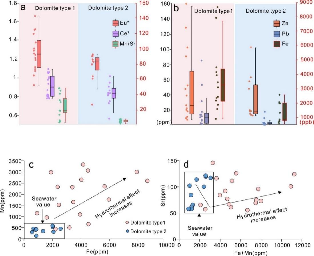 图 3地球化学数据箱式对比图展示白云岩类型1 (Tabia白云岩)与白云岩类型2(Tifnout白云岩)主要参数对比