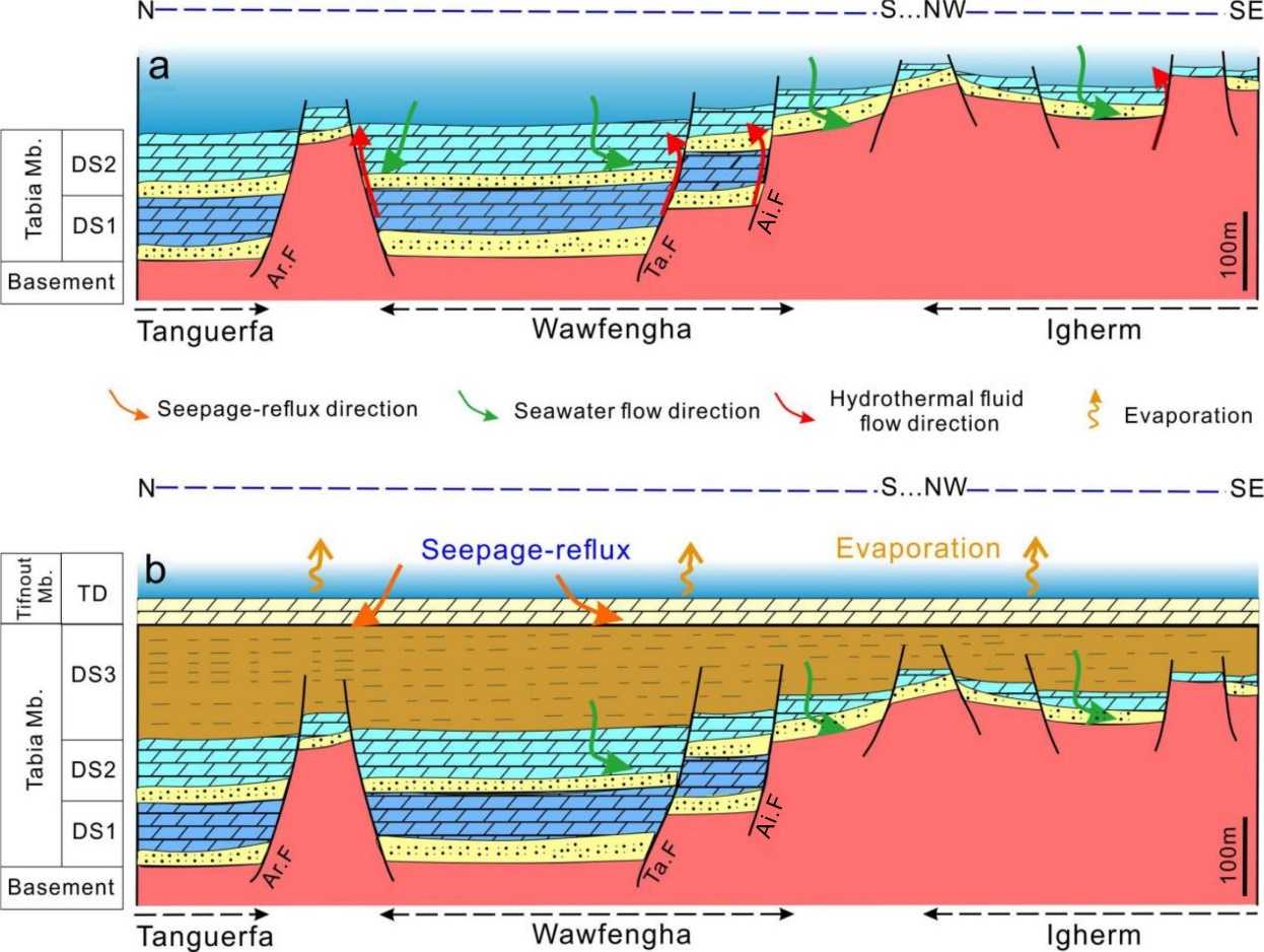 图 4 白云岩形成原因的解释性示意图展示Tabia白云岩类型(a)与(b)Tifnout白云岩形成机制的概念模型(非实际比例尺)