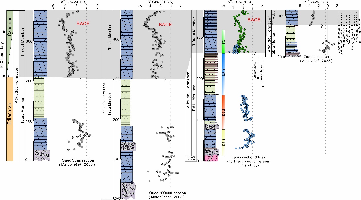地球化学数据显示,Tabia段(同裂谷期)白云岩具有显著高的⁸⁷Sr/⁸⁶Sr比值、Eu/Eu*值及Mn、Pb、Fe、Zn等金属元素富集的特征(图3),表明其白云岩化过程受热液与海水混合流体影响(图4);而Tifnout段(后裂谷期)白云岩的热液信号明显减弱(图3),反映海水主导的白云岩化过程(图4),这一差异记录了盆地构造转型过程。此外,本研究在Tabia段沉积序列三的页岩层段中发现埃迪卡拉纪晚期标志性文德带藻(Vendotaenia macroalgae),结合区域碳同位素地层对比将寒武纪的底界(BACE事件,basal Cambrian carbon isotope excursion )定在Tamjout白云岩之上约50米处(图5),该界面与盆地构造转型面基本吻合。研究认为BACE 负异常事件具有全球等时性,可为小阿特拉斯山地区及全球其它同期沉积盆地的埃迪卡拉–寒武系界线厘定提供可靠标志。