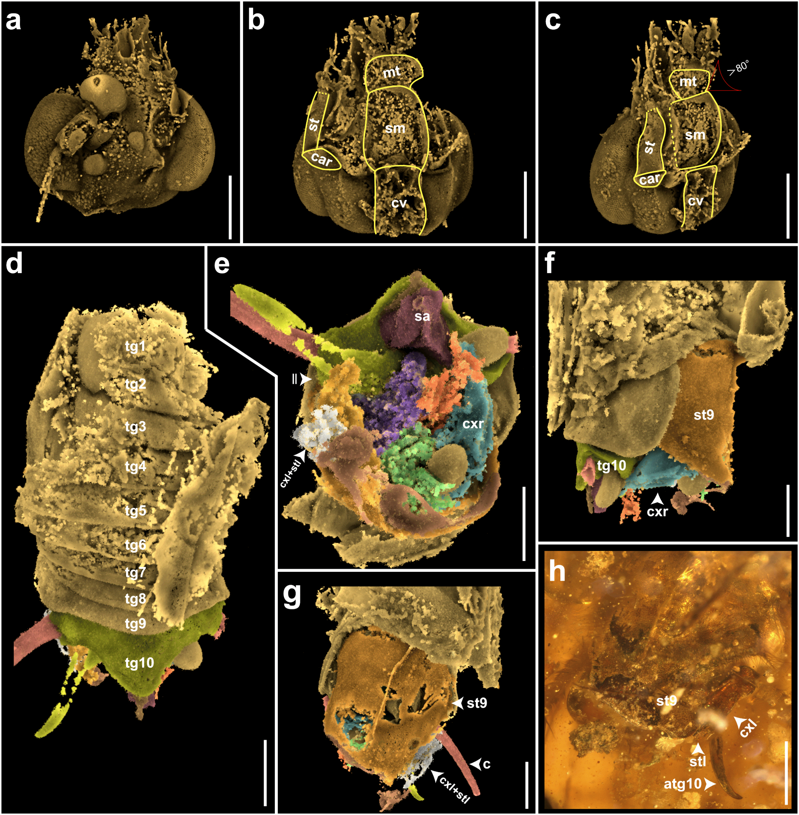 图2:长须联蠊的显微CT渲染和光学照片,头部(a–c)、腹部(d)及腹部末端(e–h)。