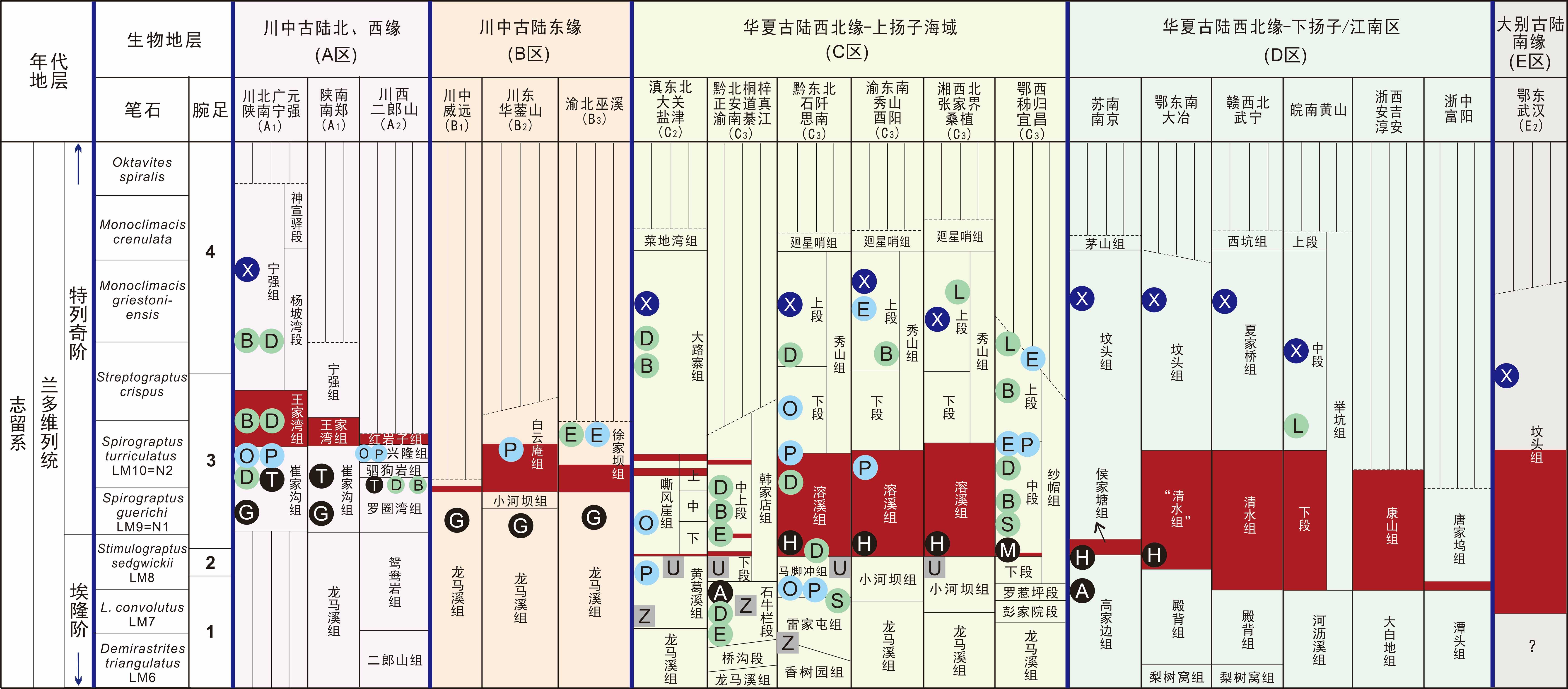 图1 各研究片区典型剖面志留系第一套海相红层的时代划分及依据。不同颜色圆形及方块示不同门类或动物群