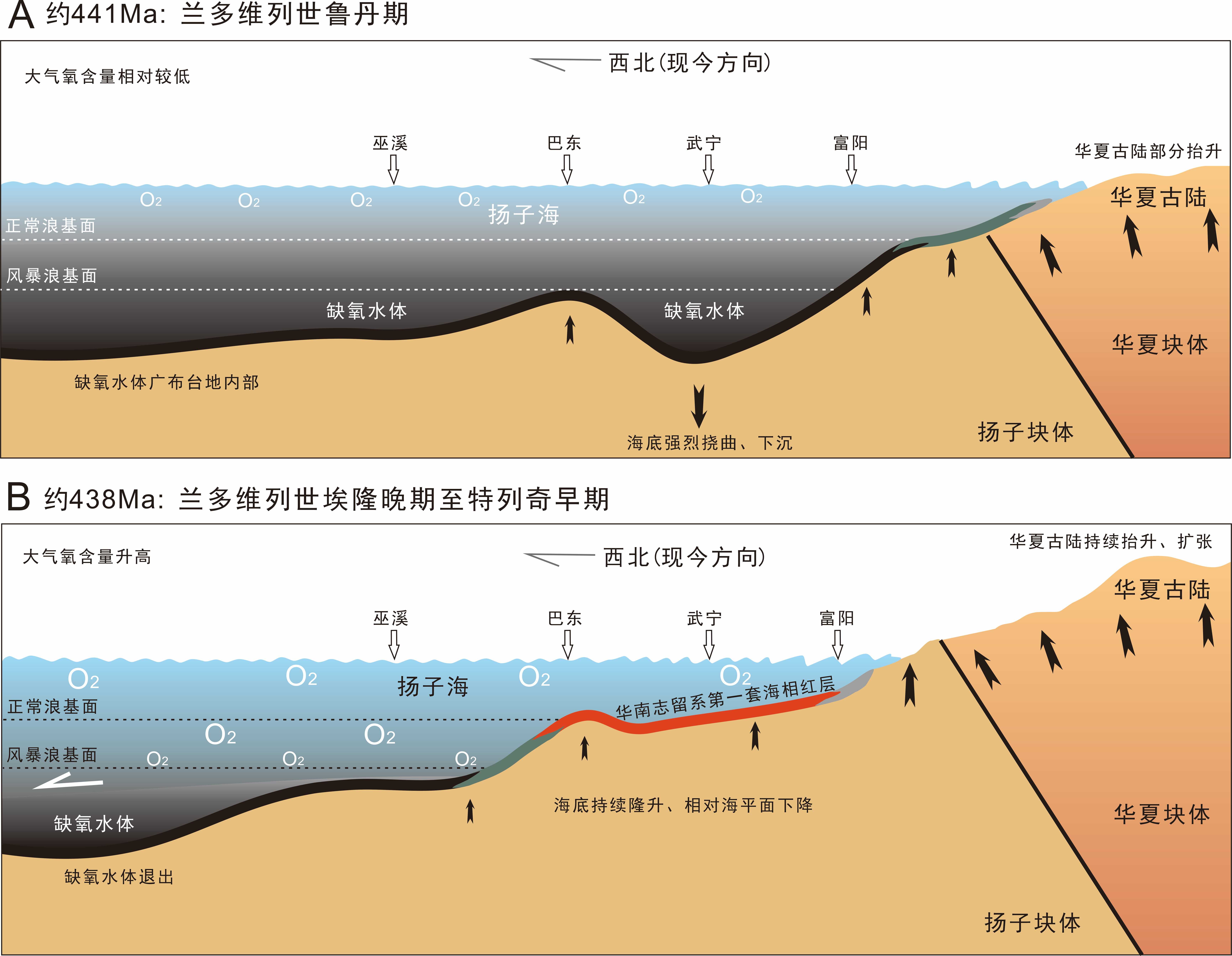 3.在全球热带海域发生海水氧化的大背景下,华南志留系第一套海相红层时空发育的模式反映了埃隆期-特列奇期界线前后约3Ma时间内,浅水海域的缺氧、半缺氧水体逐渐向外海退却,氧化水体占据统治地位的过程。这与广西运动期间华夏古陆向西北方不断扩展,引起海域底部快速、持续隆升密切相关(图3)。