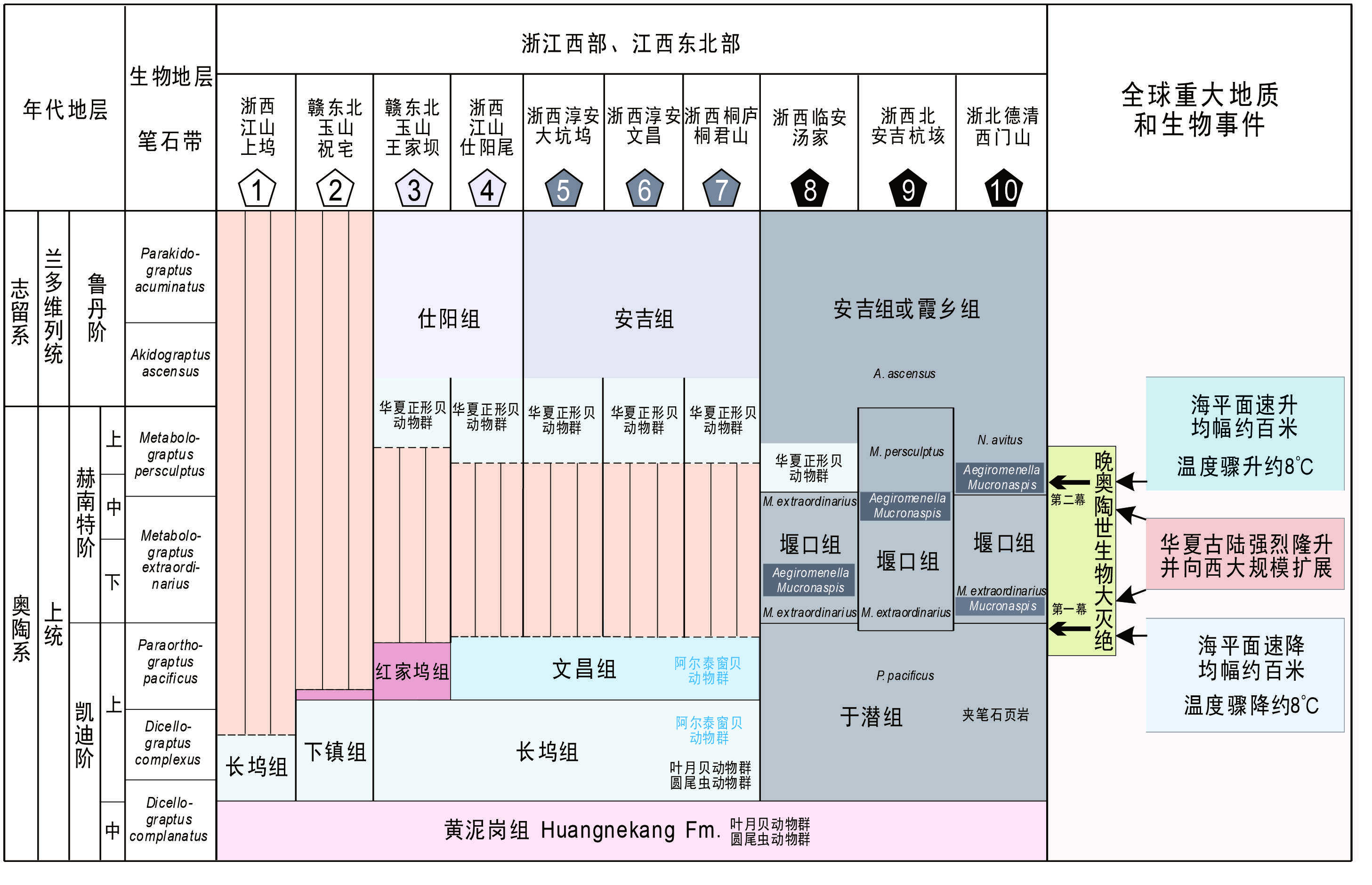 图4 浙江西部和江西东北部上奥陶统上部地层对比图并示全球重大地质和生物事件