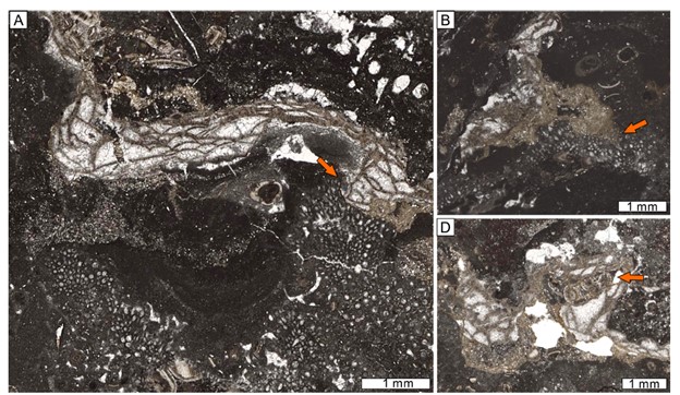 图2. 达瑞威尔晚期莫耶罗组礁体中层孔海绵和钙质微生物的显微薄片照片(橙色箭头显示钙质微生物)