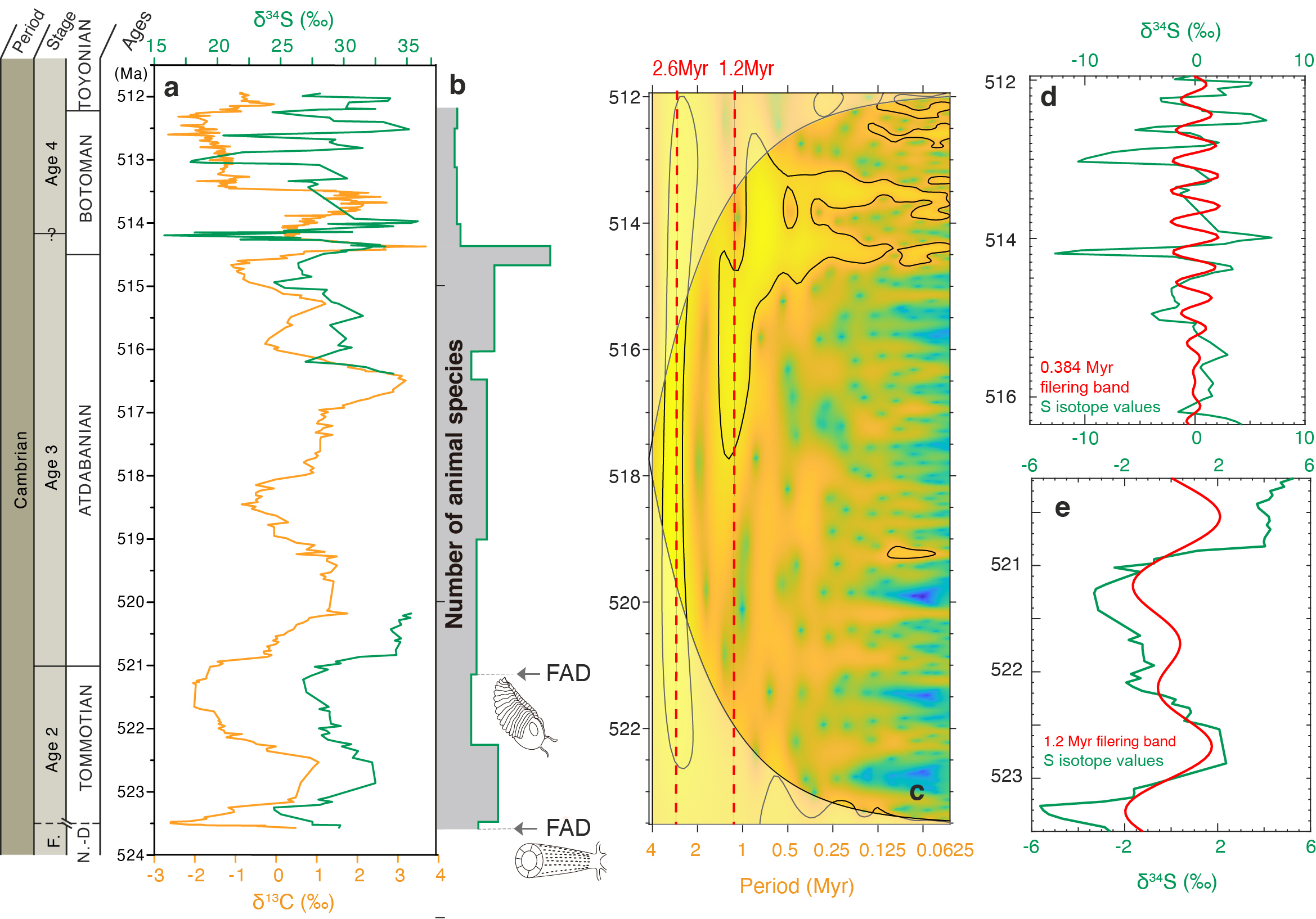 图1. 碳酸盐岩碳同位素与碳酸盐相关硫酸盐硫同位素记录。(a)西伯利亚台地寒武纪早期海水碳、硫同位素记录;(b)海洋动物物种数量变化;(c)碳同位素记录的小波分析结果;(d–e)硫同位素记录中的0.384和1.2百万年滤波输出结果。