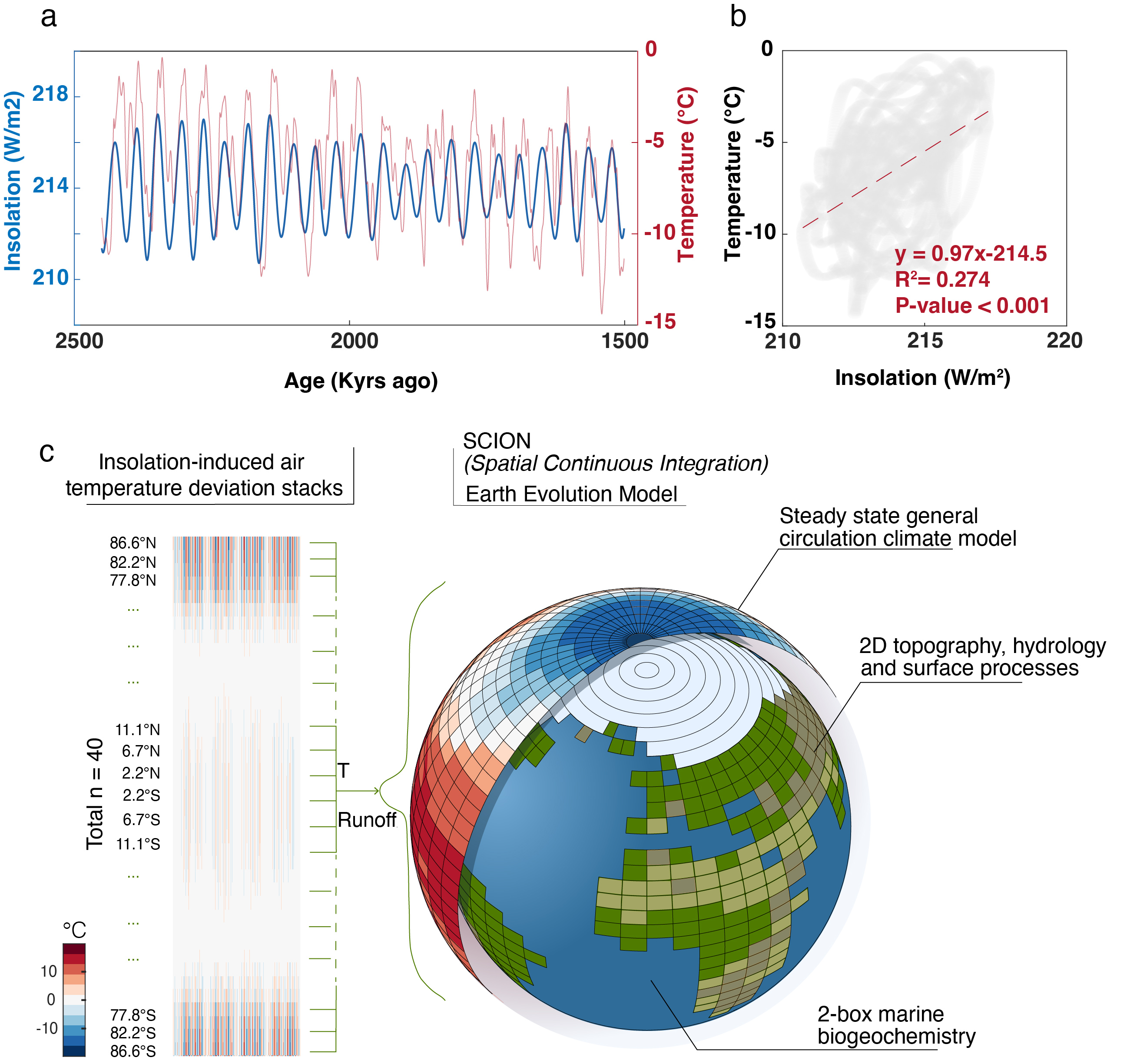 图2. SCION模型中新增的轨道驱动气候变化。(a)过去1500–2450千年间北纬65°太阳辐射量和北纬40°–80°大气温度的比对;(b)过去1500–2450千年间太阳辐射量与大气温度的散点图;(c)太阳辐射变化引起的大气温差在SCION模型气候数据集中的叠加示意图。