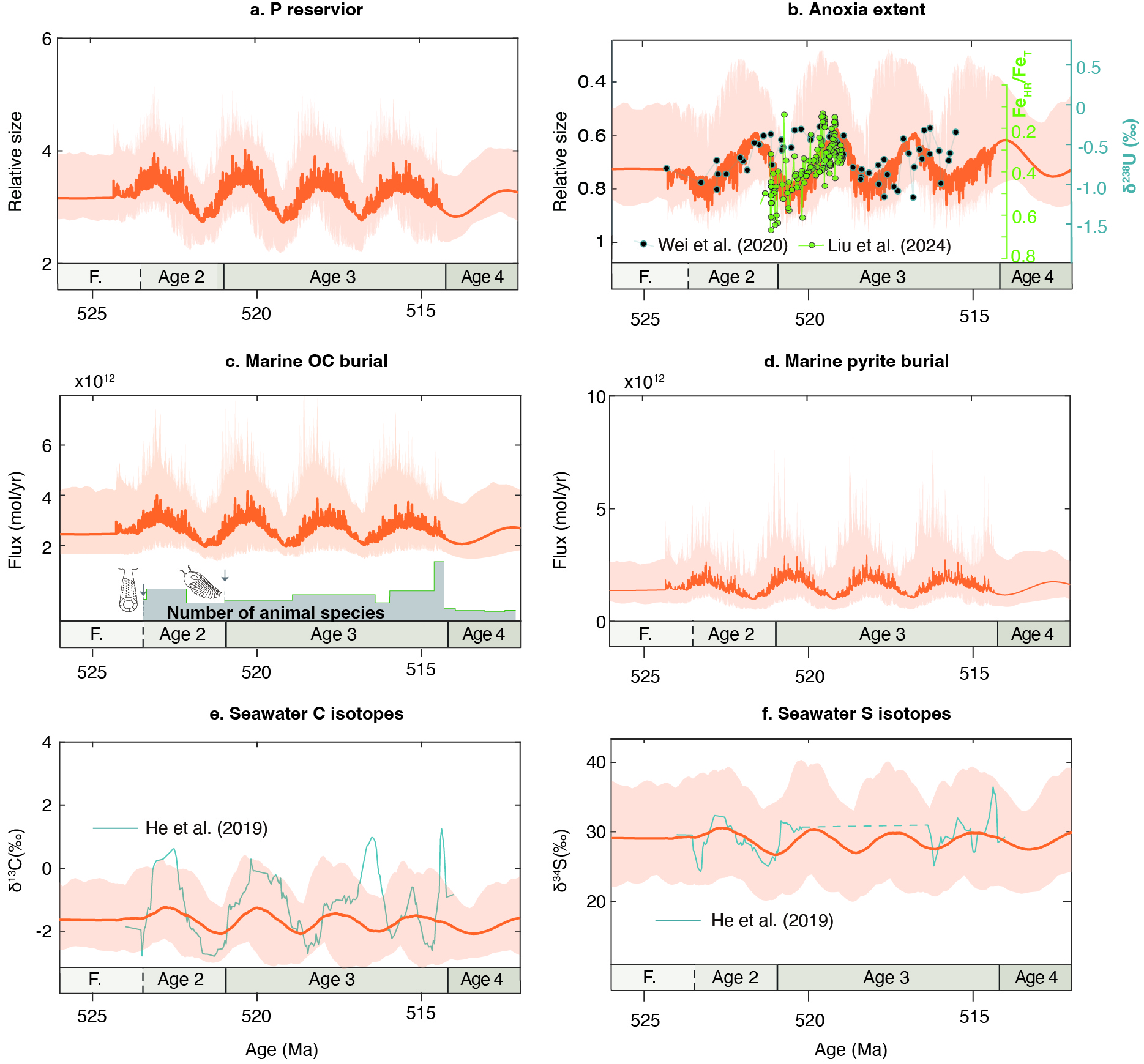图3. SCION模型模拟结果。(a)陆架区营养物质(磷)储库规模;(b)模拟的海洋缺氧程度,与铀同位素及铁组分数据对比;(c–d)陆架区海洋有机碳与黄铁矿埋藏通量;(e–f)海洋碳、硫同位素变化。