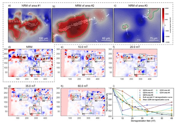 图中显示三个典型区域的NRM分布,以及在不同退磁场强(0–60 mT)下磁信号的变化过程。红、蓝色分别代表磁场方向相反的磁性区。绿色线条圈出正极性磁场的主要分布特征。右下图为五个代表性区域的退磁曲线(QDM观测结果与整体样品对比),揭示了不同微区磁性组分的退磁特征差异。这一结果表明,QDM技术能够精确识别样品内部不同来源的磁化信号,为解析多阶段重磁化过程提供了关键证据。
