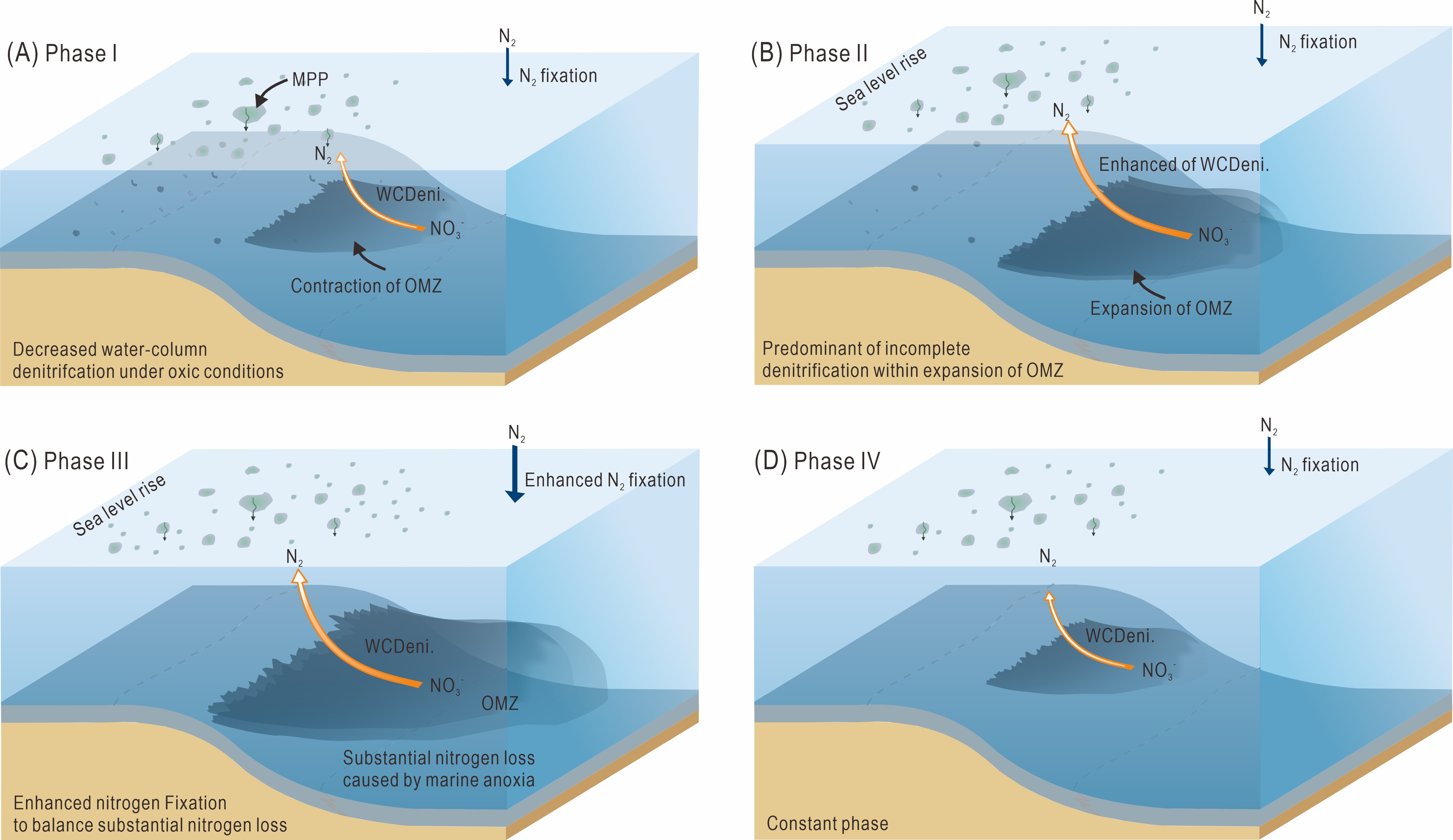 研究发现,三个剖面的氮同位素记录对比良好,其三阶段变化特征揭示了KGB变暖期间海洋氮循环与氧化还原环境变化的演变过程。阶段Ⅰ:δ15N的下降反映了水体反硝化作用速率的减弱;阶段Ⅱ:δ15N的上升表明,随着海水表面温度的升高导致海洋初步缺氧增强,不完全反硝化作用开始在海洋氮循环中占主导地位。阶段Ⅲ:KGB界线之下的δ15N记录了约7‰(15‰ - 8‰)的显著负漂,这一变化与δ13Corg、δ13Ccarb和δ238U的负漂,以及大气二氧化碳浓度和海水表面温度的持续升高相对应(图2);δ15N的显著负漂反映了生物固氮作用的增强,而该增强过程与气候变暖引起的海洋缺氧扩张,反硝化作用增强和生物可利用氮的大量亏损密切相关(图3)。本研究揭示了冰室气候下海洋氮循环对短期气候变暖和海洋缺氧扩张的响应机制,为未来研究间冰期气候条件下的海洋氮循环演化提供了重要的参考案例。