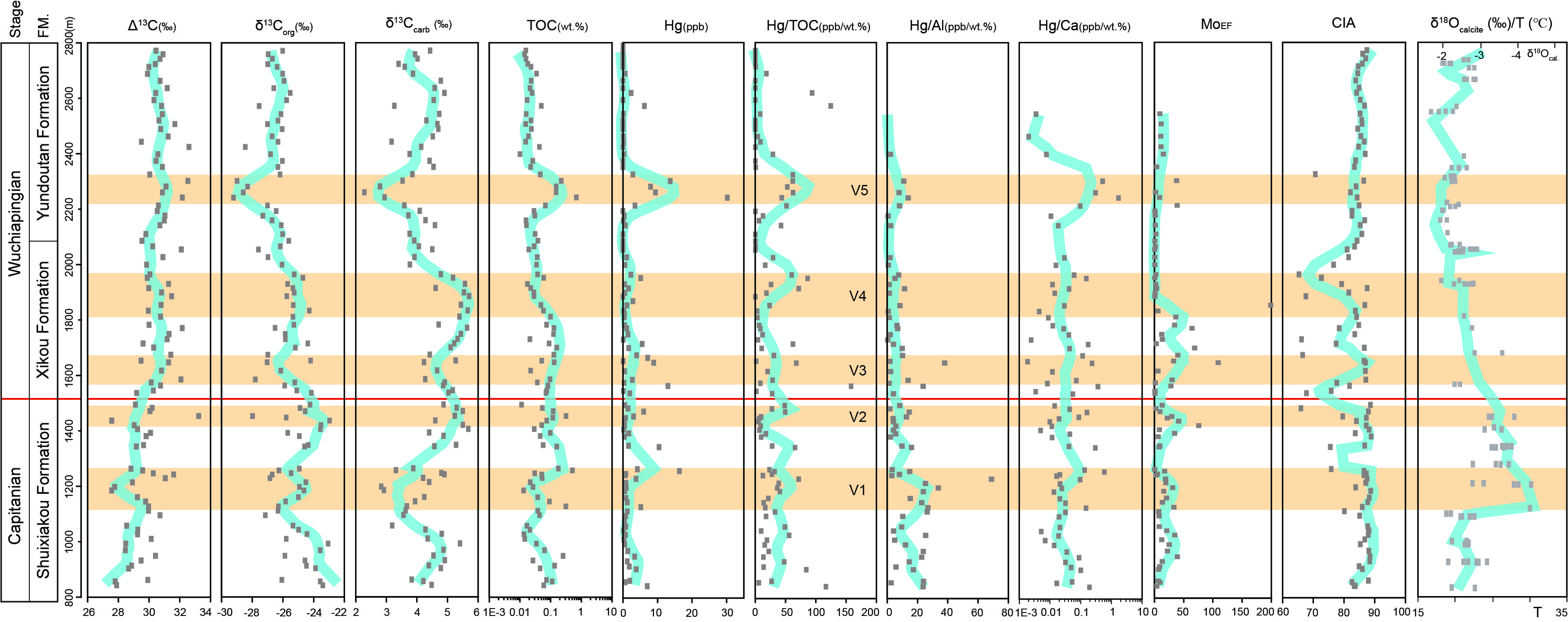 研究团队选取南秦岭陕西镇安西口剖面连续出露的碳酸盐岩序列,开展了系统的汞地球化学、碳同位素(δ13Ccarb和δ13Corg)、氧化还原敏感微量元素及化学风化指标等多参数分析。结果显示,在卡匹敦期至吴家坪期地层中识别出五次显著的汞异常脉冲(Hg/TOC峰值最高达150 ppb/wt%),每次脉冲均伴随明显的负碳同位素偏移(最大达-2.5‰)、化学风化指数升高(CIA最高达88)以及氧化还原敏感元素同步富集(MoEF最高达100)(图1)。