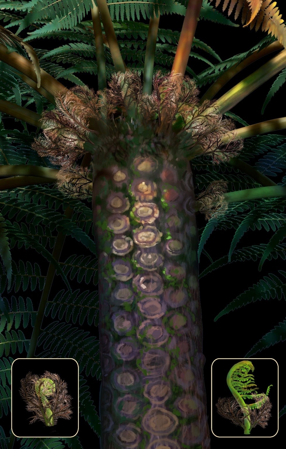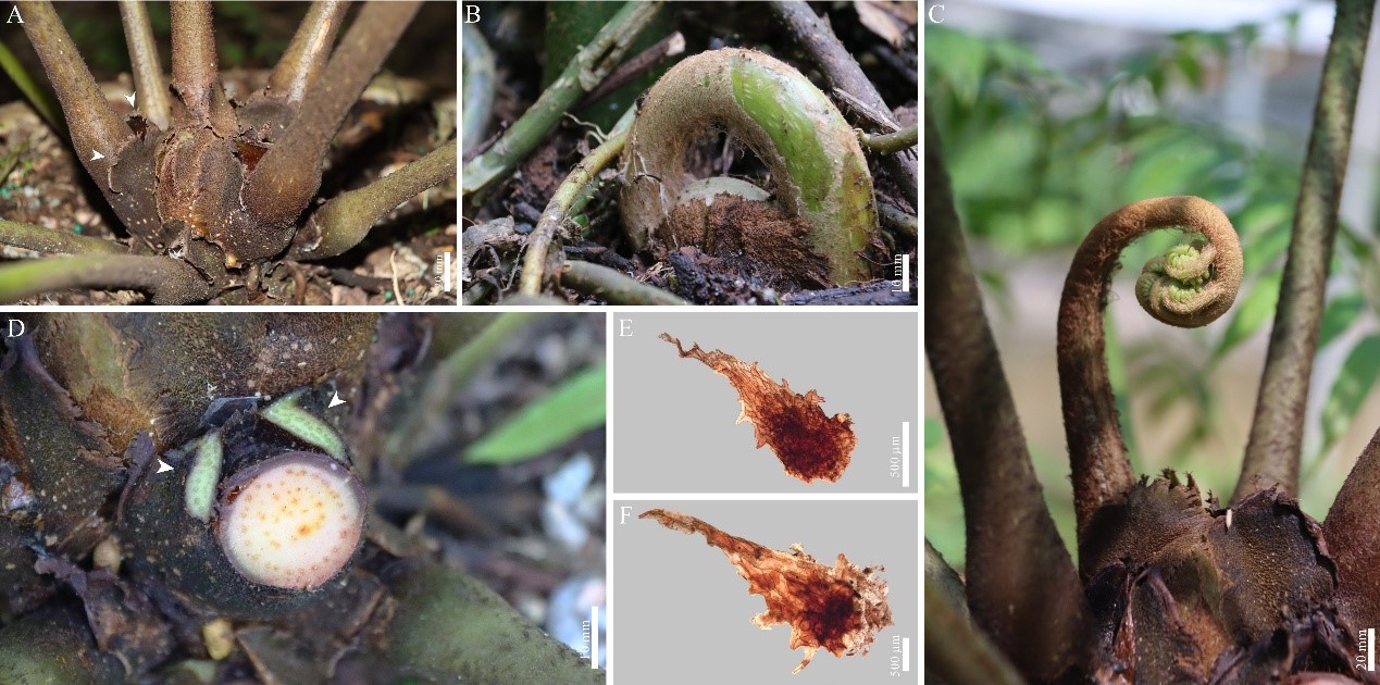 该研究表明辉木科可能为已知最早演化出现代托叶结构的维管植物类群,为托叶的早期演化与器官同源关系提供了实证基础。王军研究团队近年来对辉木科植物一系列生理、生态方面的研究,如茎干生长发育模式、繁殖器官多样性和孢子囊开裂散播机制,以及当前托叶器官的革新出现与多型功能,都极大地推动了我们对于这一远古树蕨类群的了解(图5)。