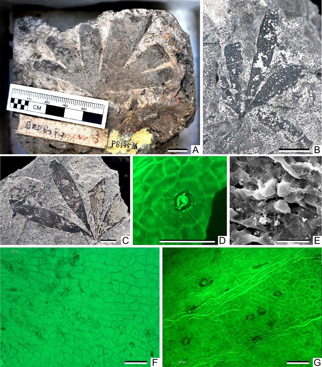 图1. 柴达木似银杏(Ginkgoites qaidamensis)代表性叶片标本及角质层结构