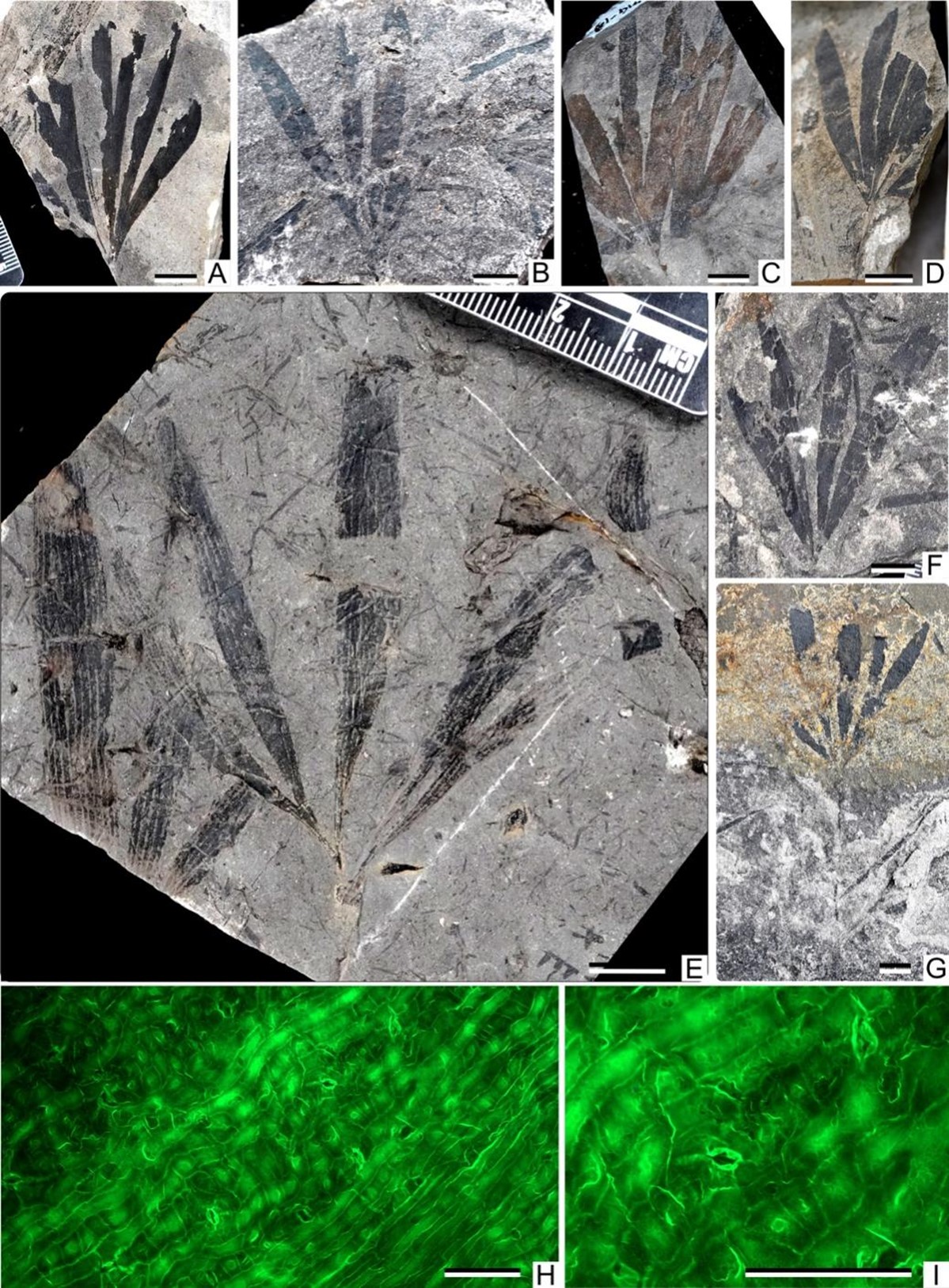图2. 长叶似银杏(Ginkgoites longifolius)代表性叶片标本及具角质层结构
