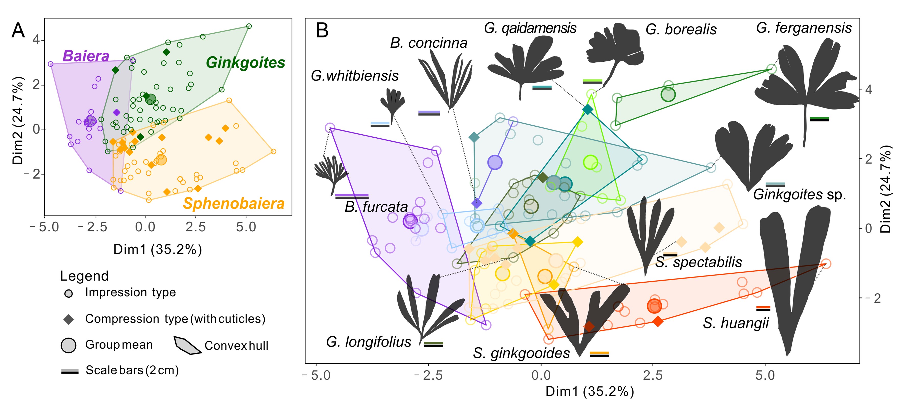 研究团队创新性采用混合数据因子分析(FAMD)方法,有效整合宏观与微观形态数据,充分证实了宏、微观特征在银杏目化石分类中的互补价值与协同作用。此外,发现柴达木似银杏(G. qaidamensis)、长叶似银杏(G. longifolius)等部分物种跨越早—中侏罗世地层仍保持稳定的形态特征,这一发现为深入理解银杏目植物的演化韧性、在中生代环境波动下的适应性策略,以及精准重建柴达木盆地乃至青藏高原东北部早—中侏罗世古气候、古生态格局提供了重要的化石证据与理论支撑。