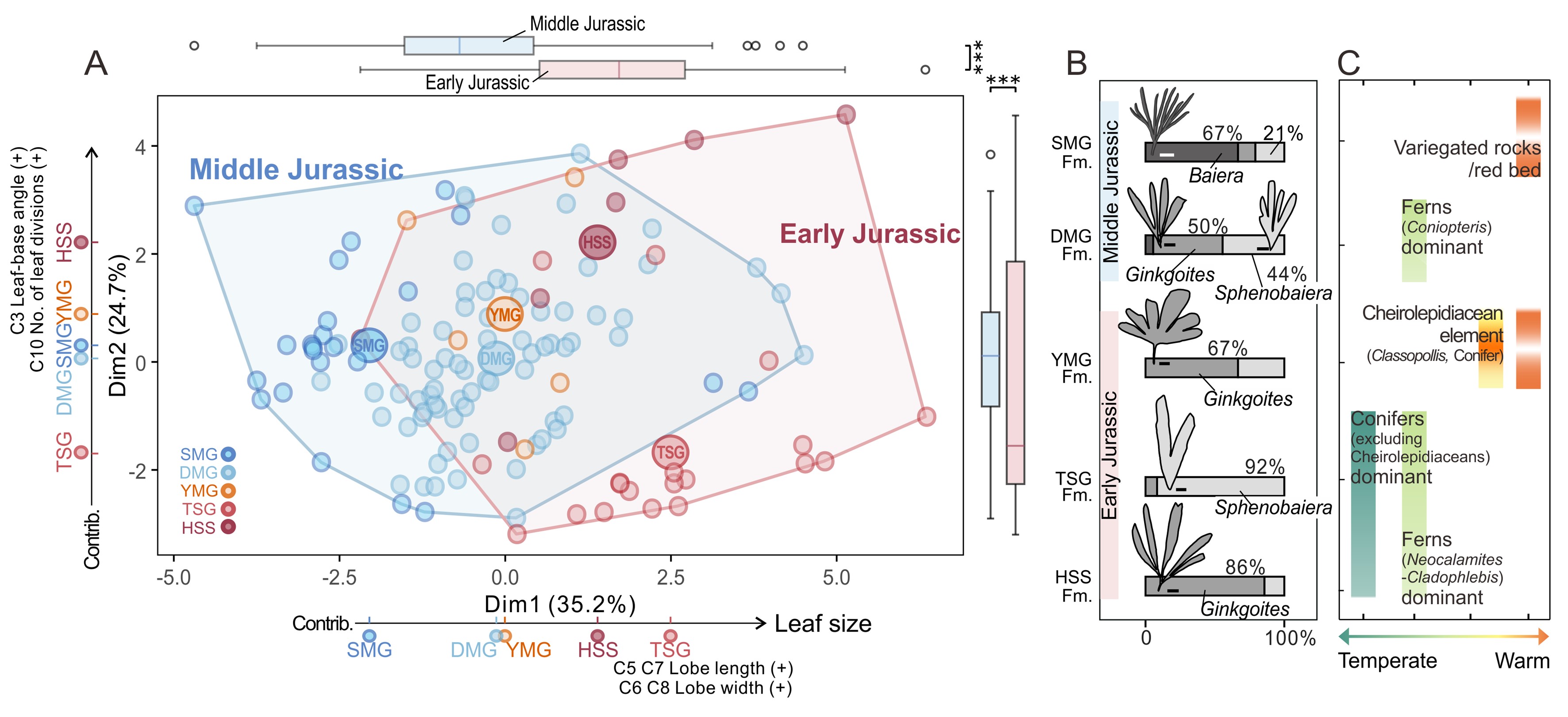 研究显示,尽管在早–中侏罗世约2000 万年时间跨度内,柴达木盆地经历了显著的气候变化,其中代表性银杏植物仍表现出叶形态和叶解剖结构的相对稳定性,表明银杏类植物在长期演化过程中兼具形态变异性与生态适应性的特征。这些发现深化了银杏目植物演化历程和适应能力的认知,为理解该时期植物对环境的适应性提供了新视角。