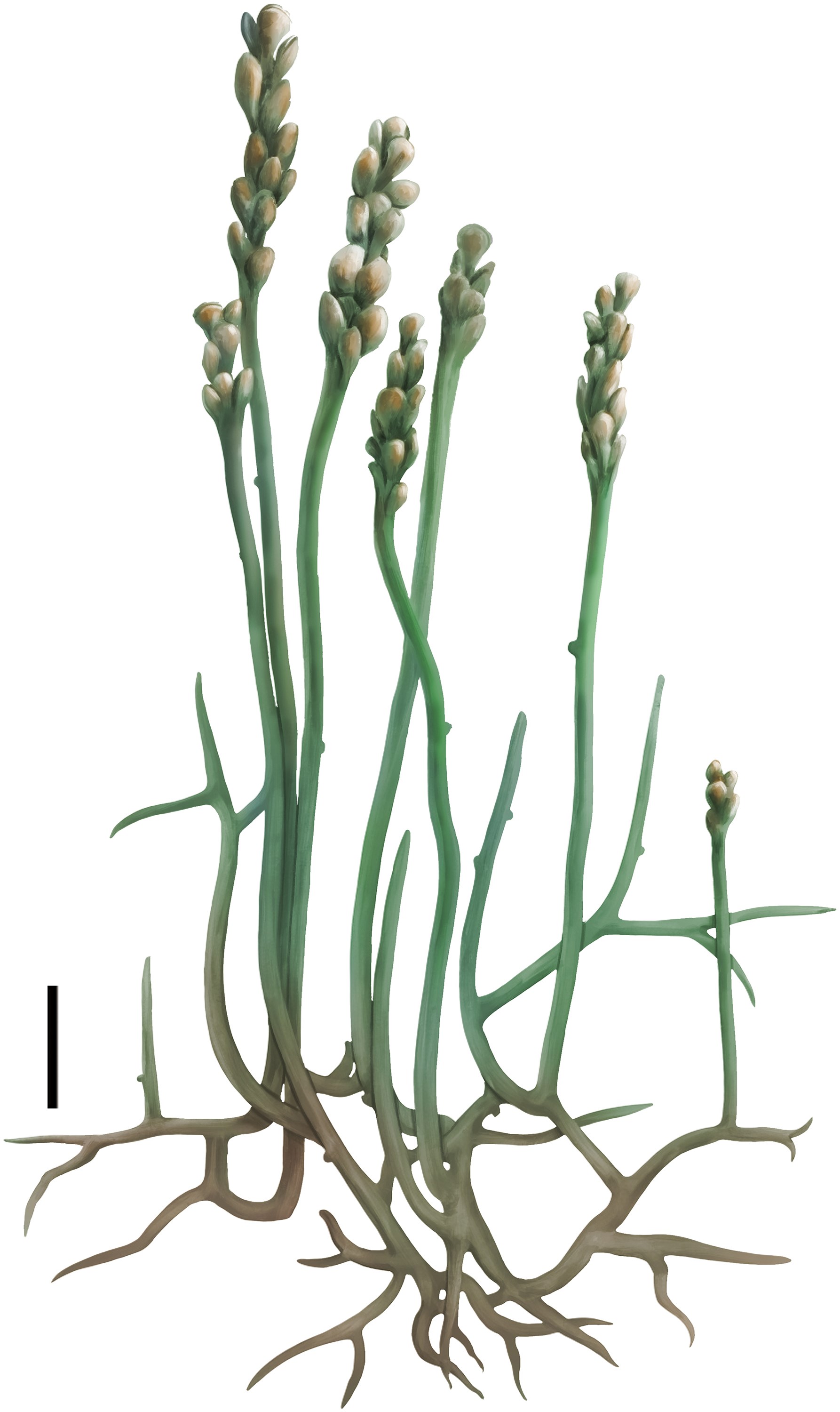 芒克鲁工蕨(Zosterophyllum mangkeluense)复原图(比例尺:10mm)