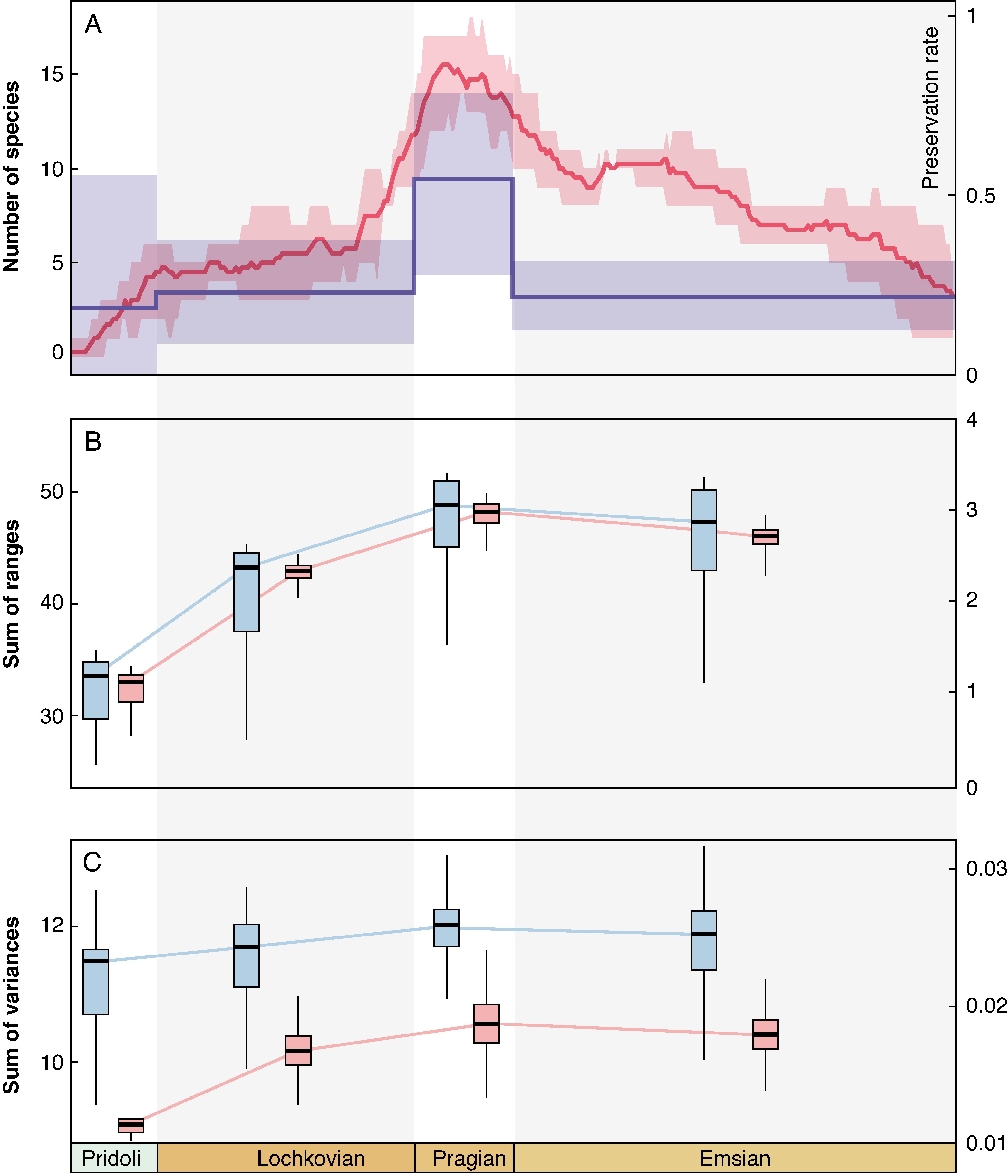 研究团队进一步收集了全球工蕨属的化石记录与18个工蕨属植物的形态学数据,通过形态空间与形态差异分析、多样性分析等方法,揭示了该属从普里道利期(Pridoli)到埃姆斯期(Emsian)的演化轨迹。研究发现,工蕨属的物种多样性在早泥盆世布拉格期(Pragian)达到峰值,但其形态空间的扩张早于物种多样性的增加,发生在普里道利期(Pridoli)到洛赫考夫期(Lochkovian),呈现出物种多样性与整体形态差异解耦的演化模式,表明形态创新可能是推动早期陆生植物多样化的重要驱动力。