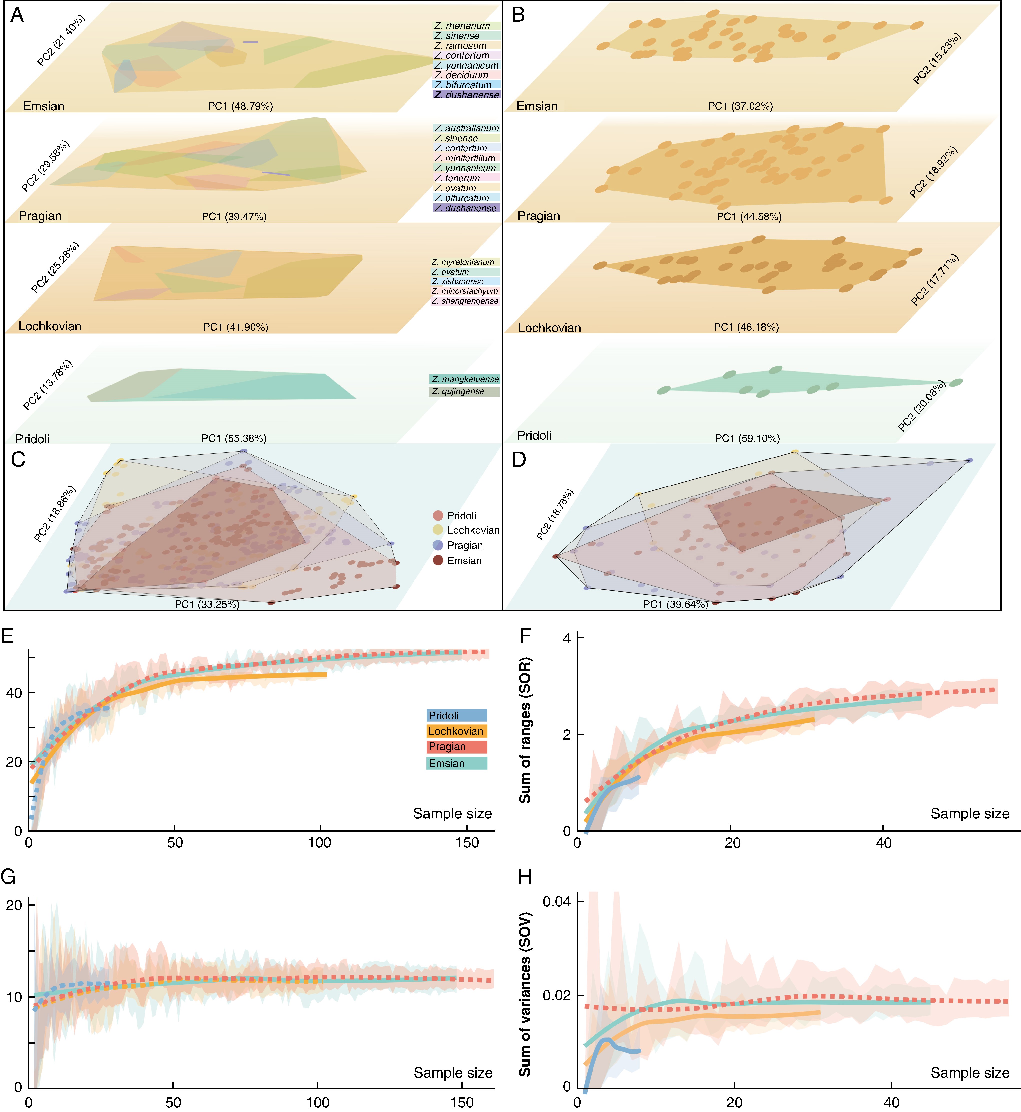 工蕨属植物整体(A, C)与孢子囊(B, D)形态空间及稀疏化(E-H)分析