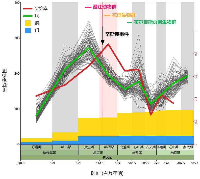 寒武纪时期全球生物多样性变化曲线,示全球顶级软躯体化石群的时代分布花垣生物群的时代紧接显生宙第一次生物大灭绝“辛斯克事件”之后