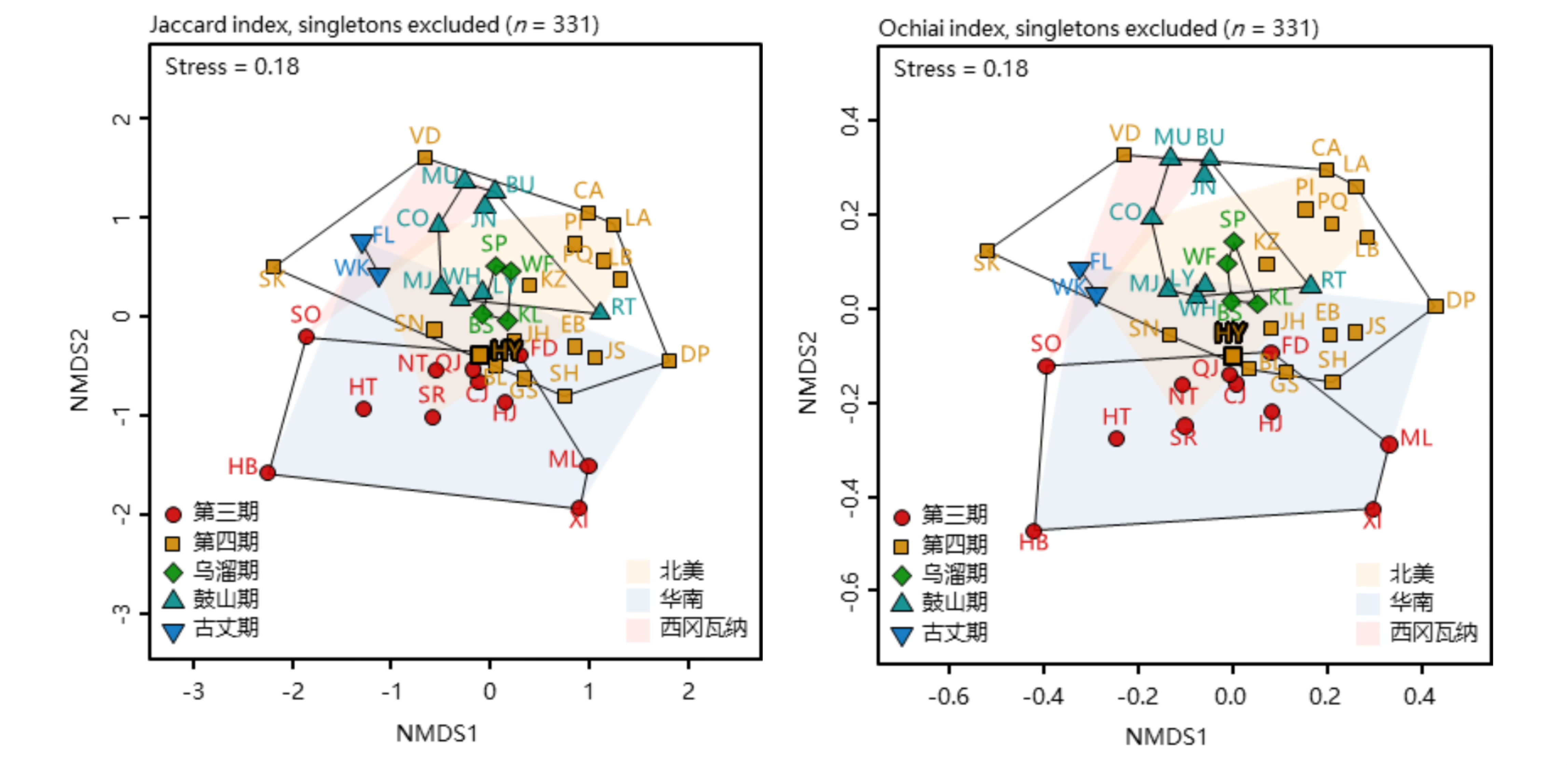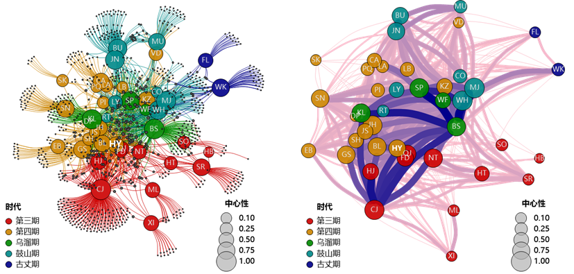(5)花垣生物群与寒武纪时期软躯体化石群的大数据比较分析揭示了显生宙第一次大灭绝事件前后全球海洋动物群落面貌发生了重大转折:为进一步解析花垣生物群的科学意义及辛斯克事件前后全球寒武纪软躯体生物群的演变规律,研究团队对包括花垣生物群在内的45个寒武纪布尔吉斯页岩型软躯体化石群开展了大数据分析。在整理出3149条物种产出信息、965个属的生物多样性数据集的基础上,团队采用非度量多维尺度分析,揭示出辛斯克灭绝事件前后全球生物群的组成存在明显差异,表明寒武纪演化生物群在辛斯克事件中发生了重大转变。通过网络和距离分析,表明花垣生物群与布尔吉斯页岩生物群之间存在较紧密的联系,由于二者均属于外大陆架深水生物群,暗示了外大陆架深水环境在灭绝事件前后扮演了生物避难所、演化创新起源地的重要角色。