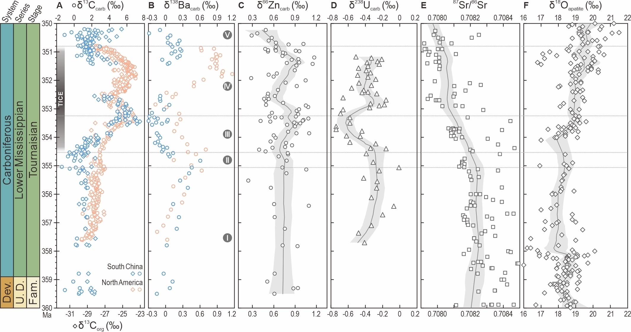 石炭纪初期(~355 Ma)是泥盆纪温室气候向石炭纪冰室气候转换的一个重要时期,发生了一次显生宙最显著的两幕式全球碳循环扰动,即中杜内期碳同位素正漂移TICE事件。针对TICE事件的碳循环过程与机制开展深入研究,可以为探讨地质历史中关键气候转折期的地球表层系统演化提供重要启示。