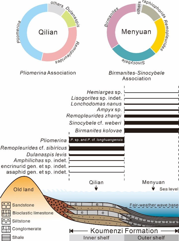 这套浅水三叶虫动物群多样性较低,仅6属7种,被识别为Pliomerina组合。其中,Dulanaspis和Amphilichas两属均为北祁连山首次报道。北祁连山晚奥陶世凯迪期的三叶虫可分为两个生态组合,即祁连地区浅水Pliomerina组合以及门源地区较深水Birmanites-Sinocybele组合,它们显示出同一地块不同水深环境下显著的生态分异。古地理方面,祁连地区的Pliomerina组合属于晚奥陶世原特提斯多岛洋(Proto-Tethys Archipelagic Ocean)三叶虫Pliomerina和或Sinocybele分区的一部分。三叶虫证据表明,晚奥陶世北祁连山的古地理位置更靠近哈萨克斯坦地块群,尤其是Chu-Ili和Chingiz-Tarbagatai地块。例如,Dulanaspis levis既出现在北祁连山的扣门子组,也见于Chu-Ili地块的Dulankara组;Remopleurides cf. sibiricus还报道于Chingiz-Tarbagatai地块的Karagach组。而Pliomerina cf. longhuangensis和Pliomerina sp.则为北祁连山的地方分子。