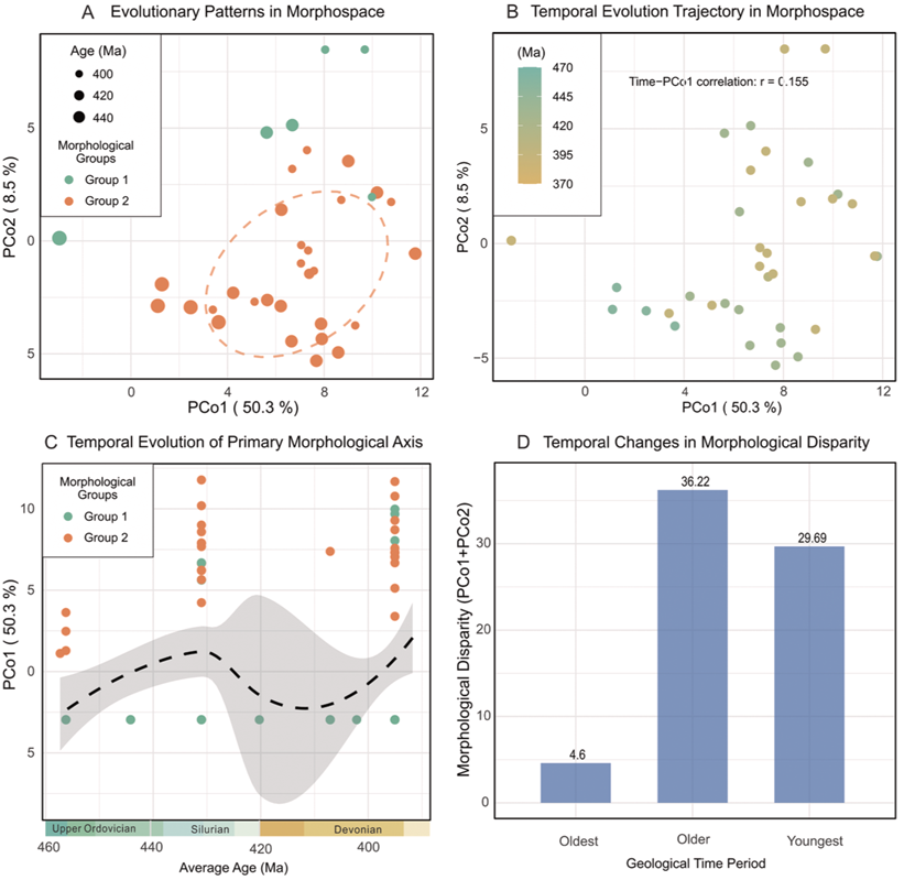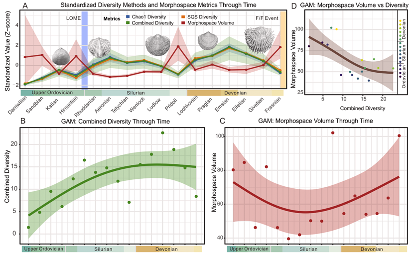 为了破解这一横跨一亿年的演化谜题,研究团队不局限于传统的多样性研究,而是建立了一套多维度的交叉分析框架。基于超1700条经过严苛清洗的高精度空间分布记录,团队提取了159个核心属的47个离散形态特征构建了形态空间矩阵。运用广义加性模型(GAMs)、PELT变点检测,以及时间序列形态差异度分析(DTT)等前沿定量古生物学方法,研究人员高精度重构了无洞贝长达一亿年的形态空间演化与多样性动态轨迹(图1,图2)。
