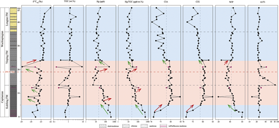 与此形成鲜明对比的是,后期与峨眉山大火成岩省相关的汞异常信号虽然相对较弱,却伴随着显著的负碳同位素漂移和化学风化增强的证据,表明由火山活动导致的大规模CO2排放引发了全球性变暖。研究还认为,在火山活动峰值之后,增强的硅酸盐风化和有机碳埋藏促进了大气CO2的消耗,从而驱动了后续的气候冷却。