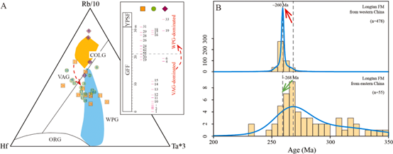 图2 研究区凝灰(质泥)岩的构造背景判别(A)及华南东、西部龙潭组砂岩年轻碎屑锆石的年龄组成对比(B)