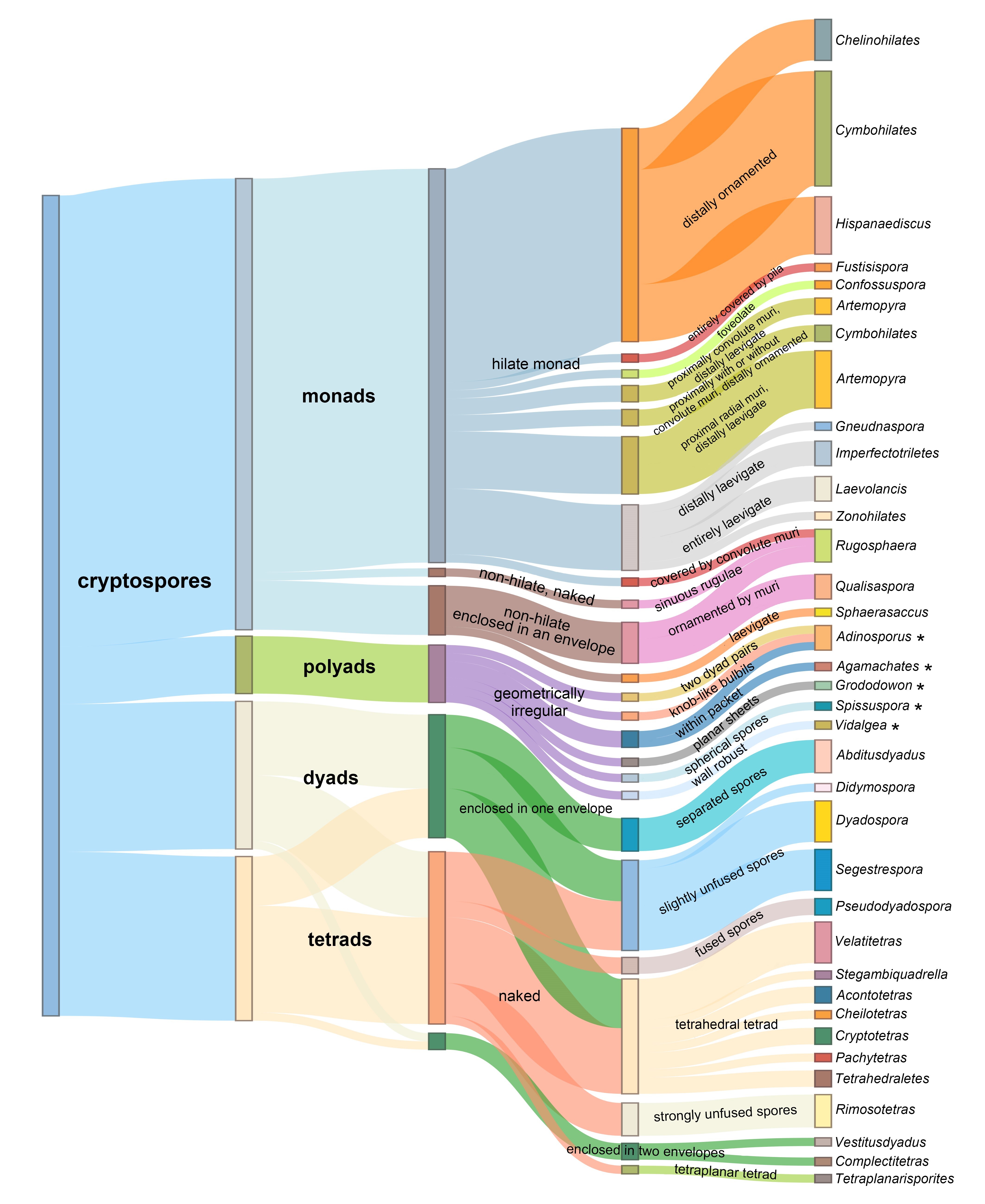 研究认为,现有化石的形态多样性和地理分布表明,晚奥陶世是早期陆生植物演化的首个辐射期。至志留纪早期,全球陆生植物群落的面貌已开始出现地理分化。随着早期三缝孢的出现和多样化,在志留纪中晚期,这种地理分化变得更加显著,而在此期间,隐孢子未显示出进一步的形态多样化。尽管处于其演化历史的晚期,早泥盆世仍然是隐孢子母体植物的一个重要繁盛期。
