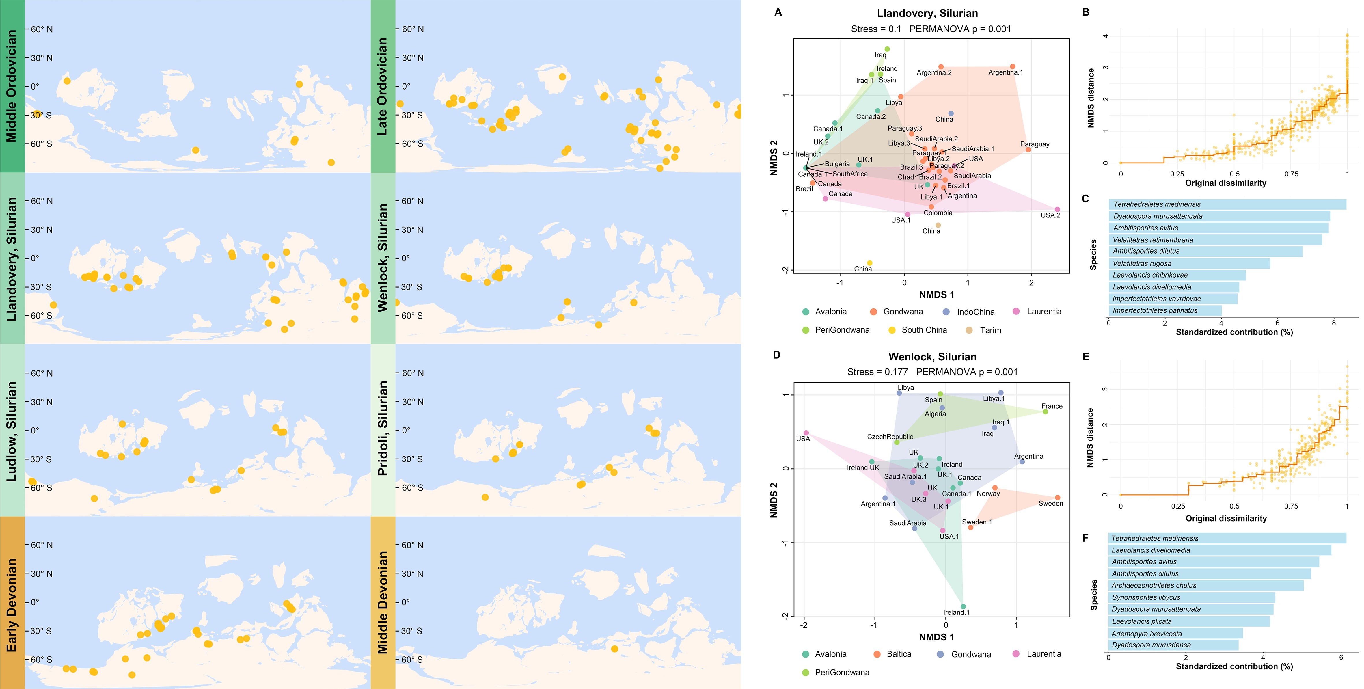 隐孢子的古地理分布(图左)和早期孢型化石组合的非度量性多维标度变换、SIMPER分析结果(图右)