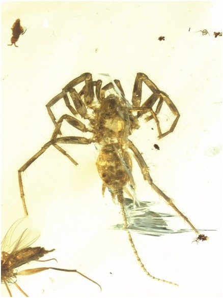 在应嫣灵女士提供的1亿岁“高龄”的缅甸琥珀化石中,其中两个蜘蛛均为雄性,个体微小,体长不足2毫米(不算尾须),身体分为头胸部和腹部,头胸甲正前方有6个眼睛。